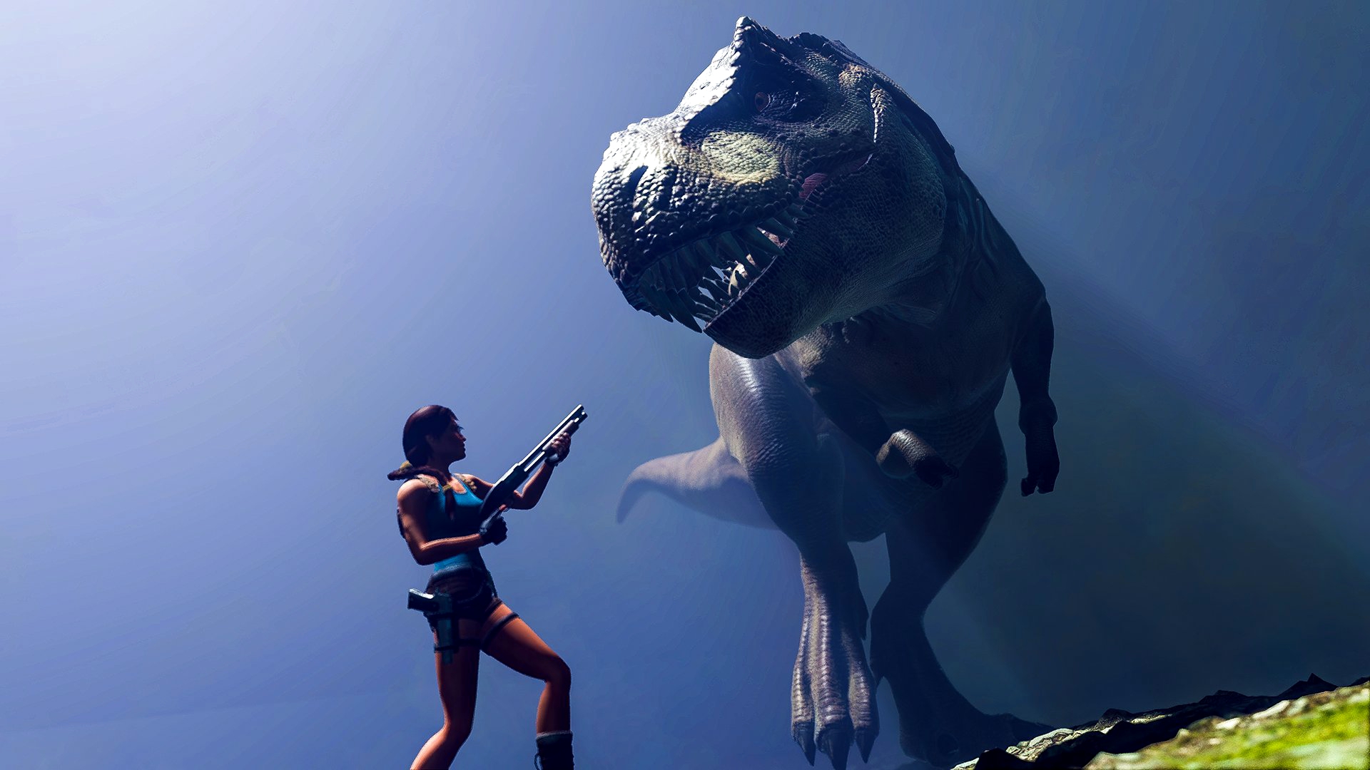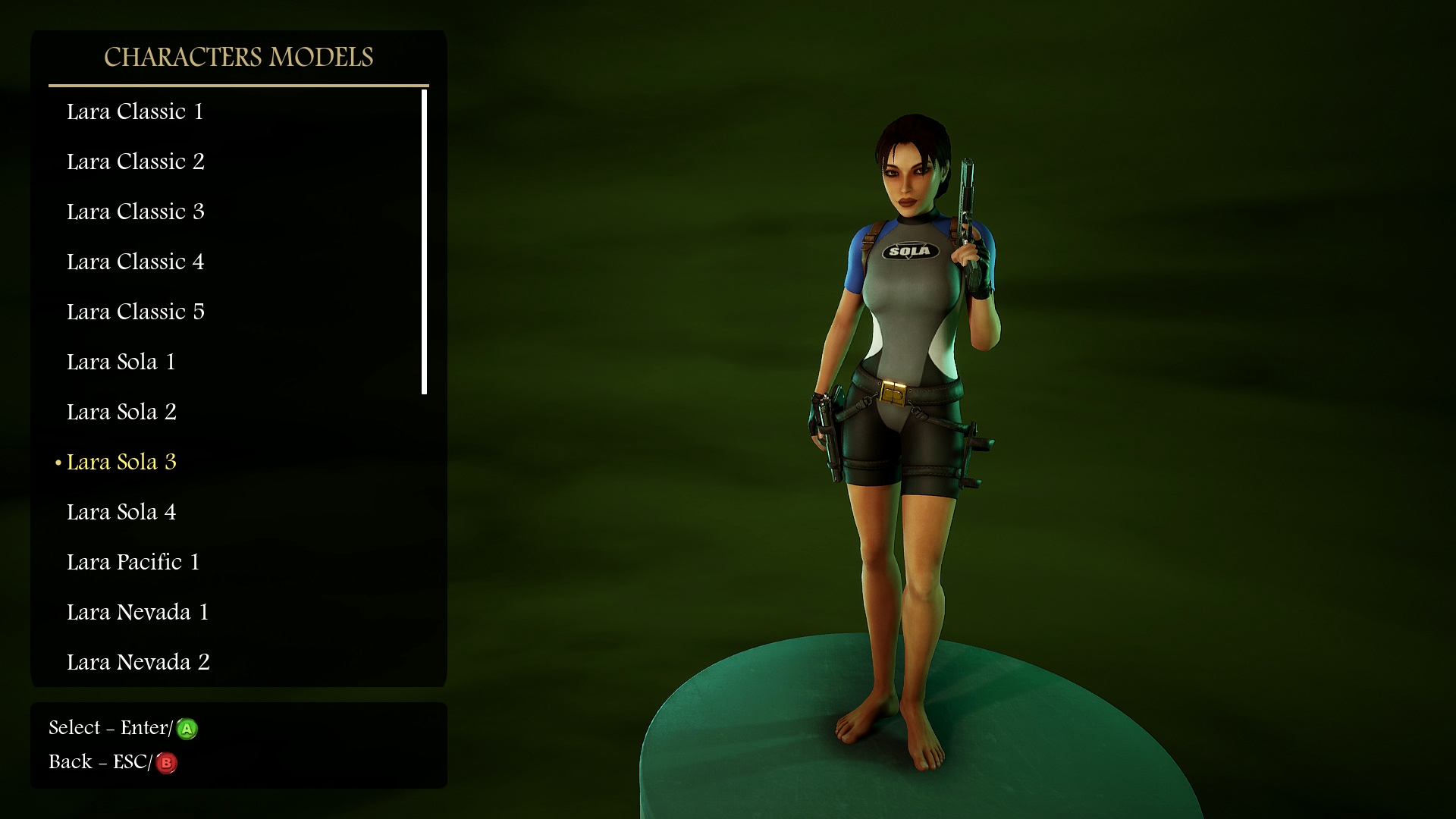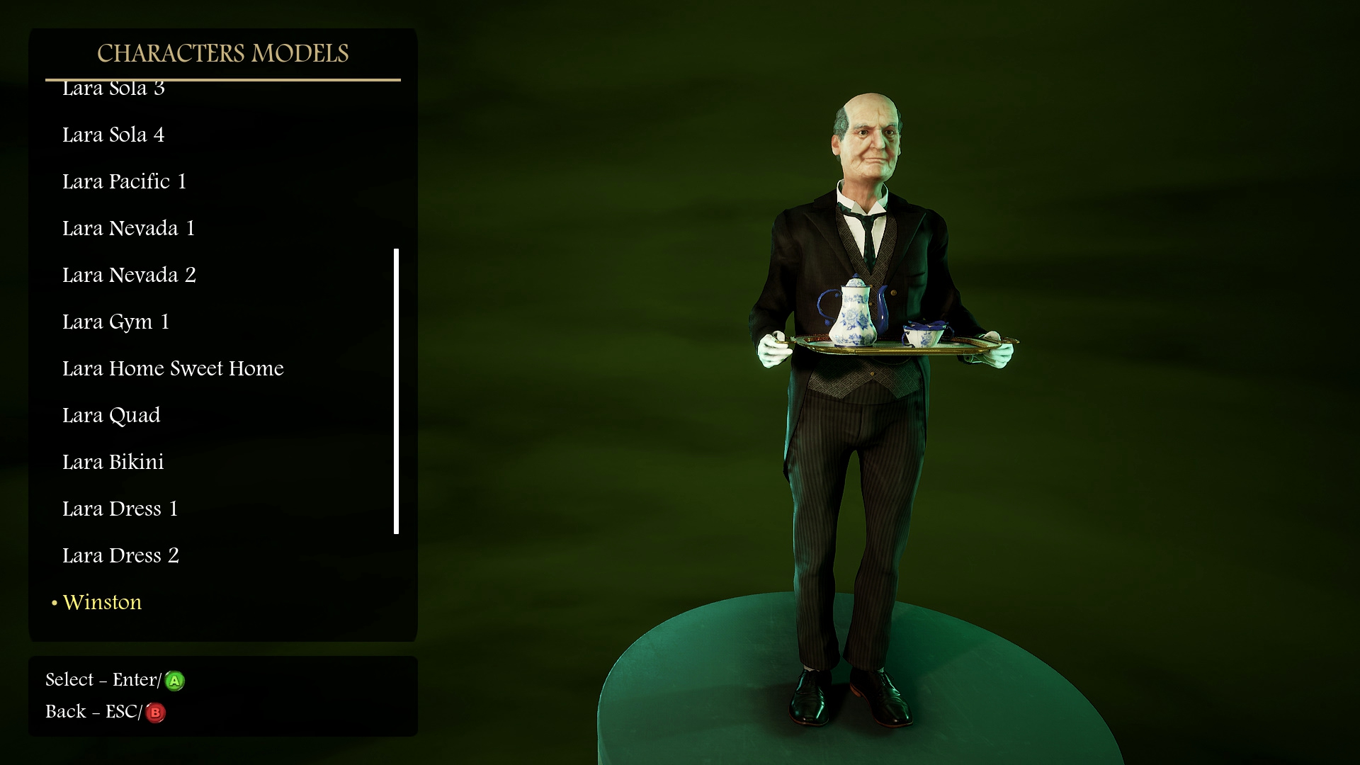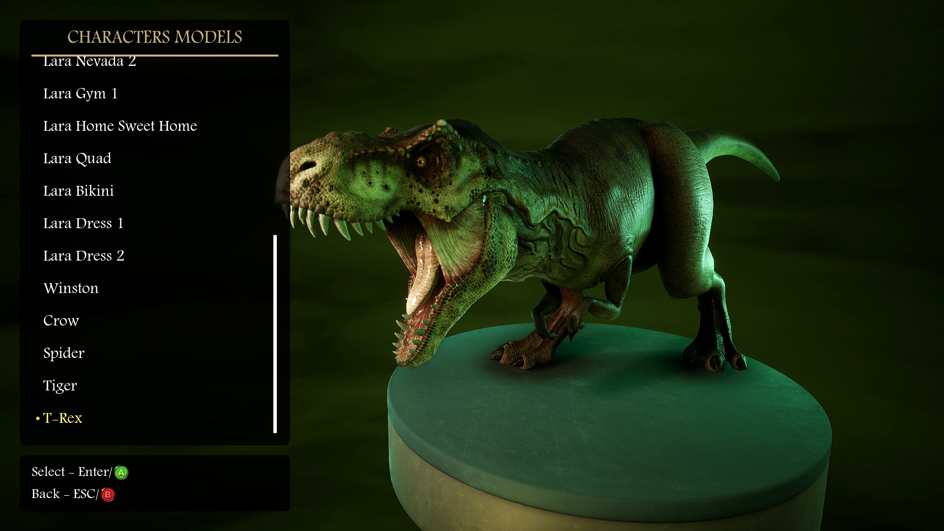 Вернувшись в меню мы можем поглазеть на модельки Лары в различных костюмах, включая из других частей, а также на Уинстона и Тирранозавра. Правда всё это добавили уже с релизом патча для демо-версии, вышедшей в 2021 году. В то же время патч привнёс новые костюмы и фото-режим.