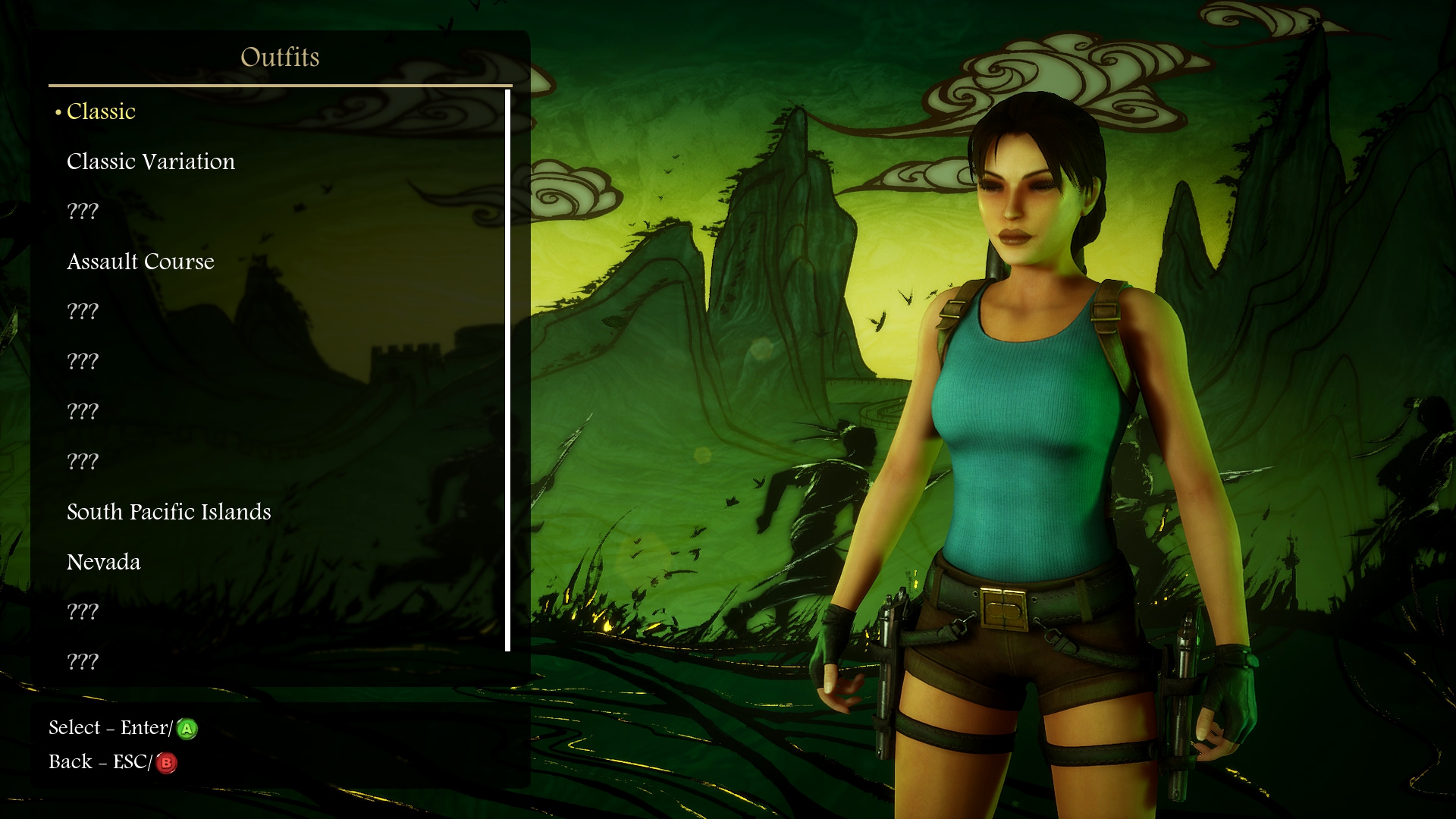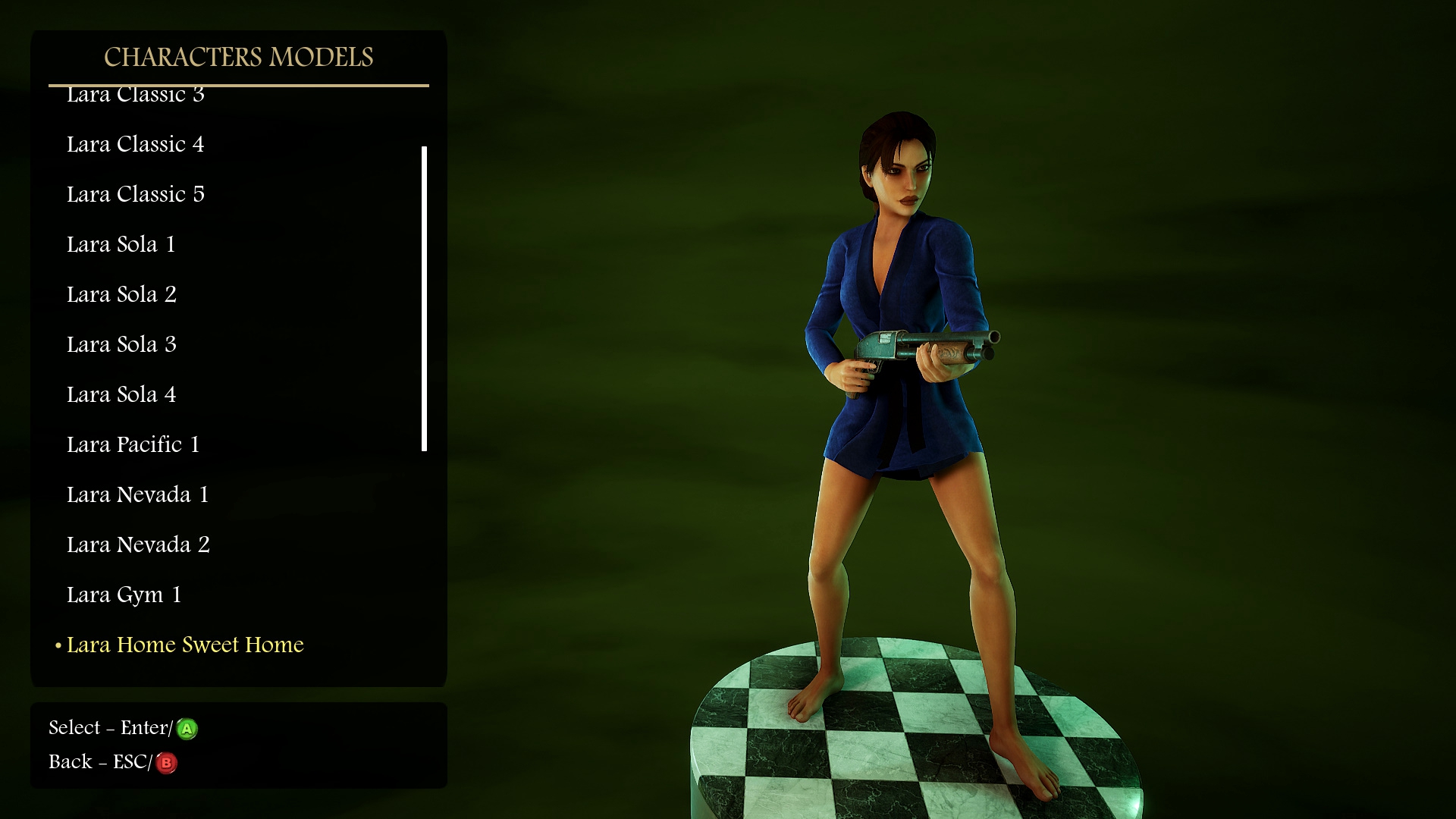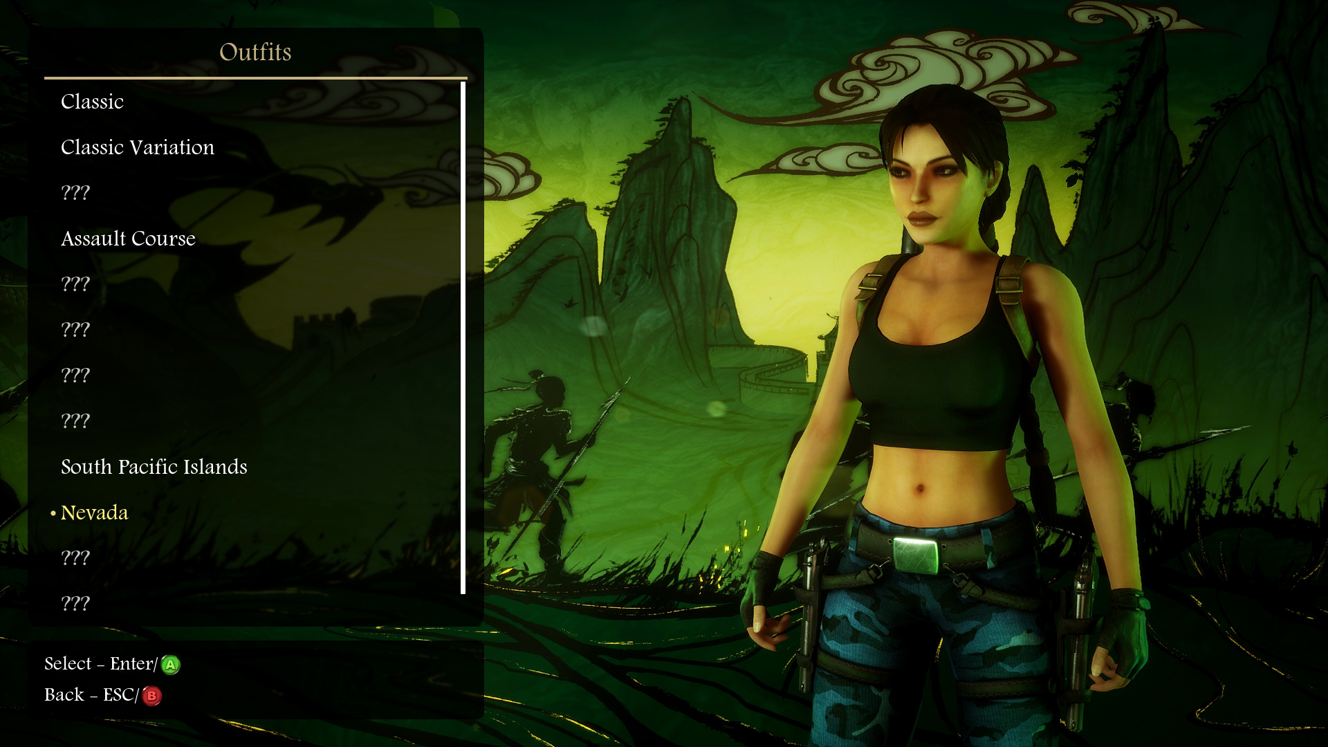 Вернувшись в меню мы можем поглазеть на модельки Лары в различных костюмах, включая из других частей, а также на Уинстона и Тирранозавра. Правда всё это добавили уже с релизом патча для демо-версии, вышедшей в 2021 году. В то же время патч привнёс новые костюмы и фото-режим.
