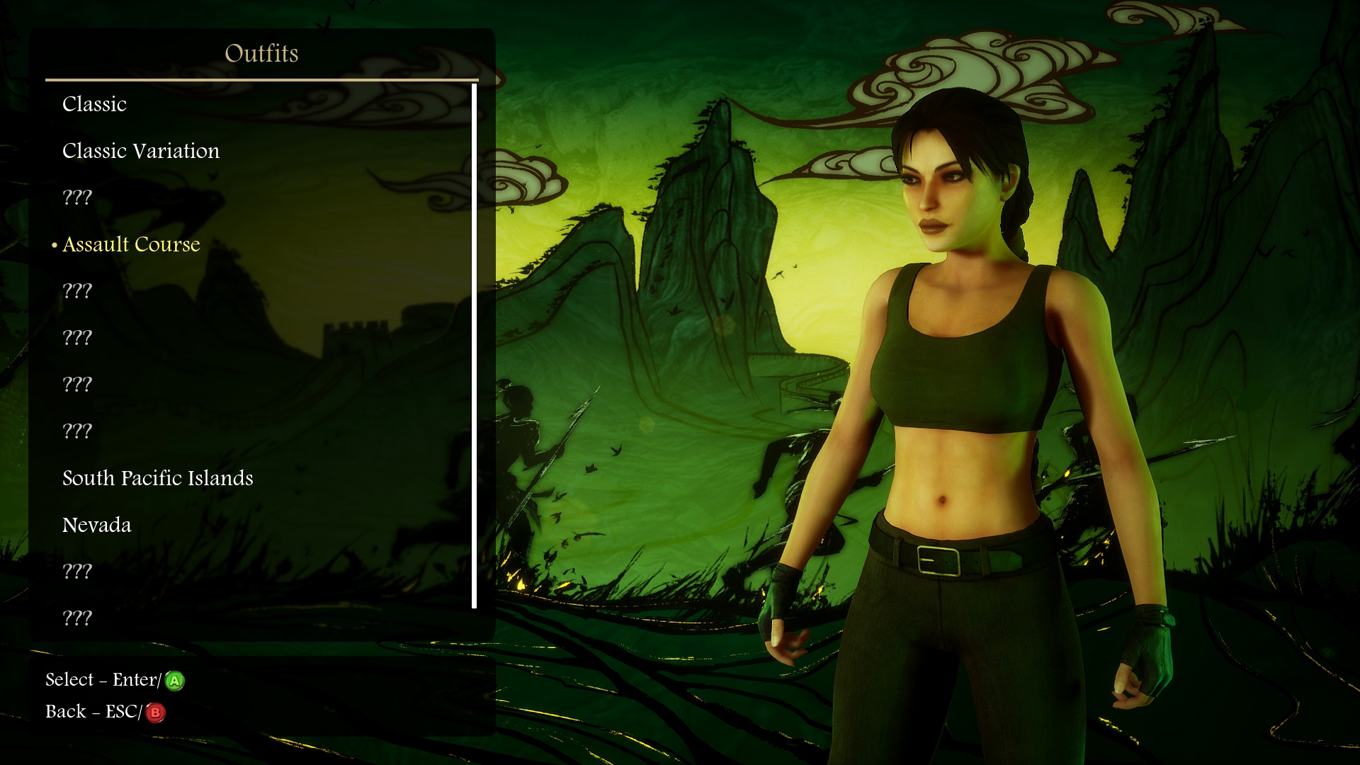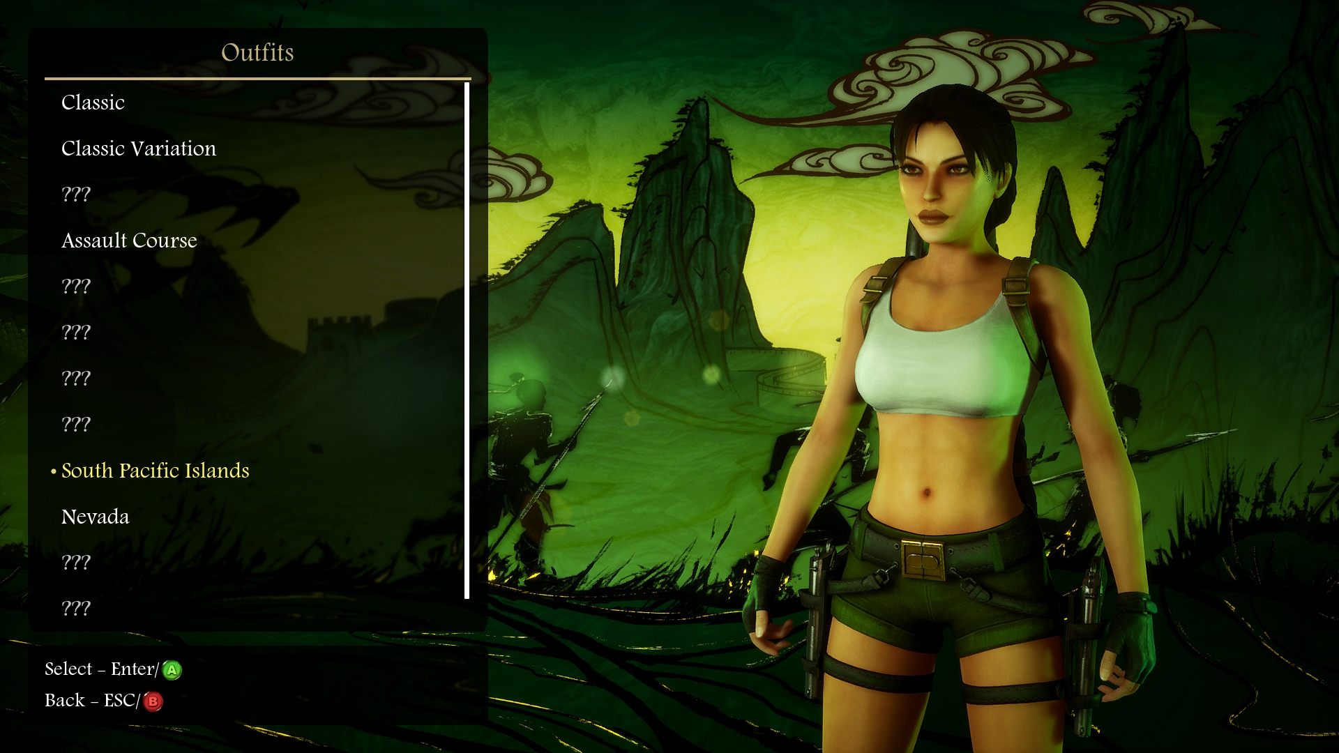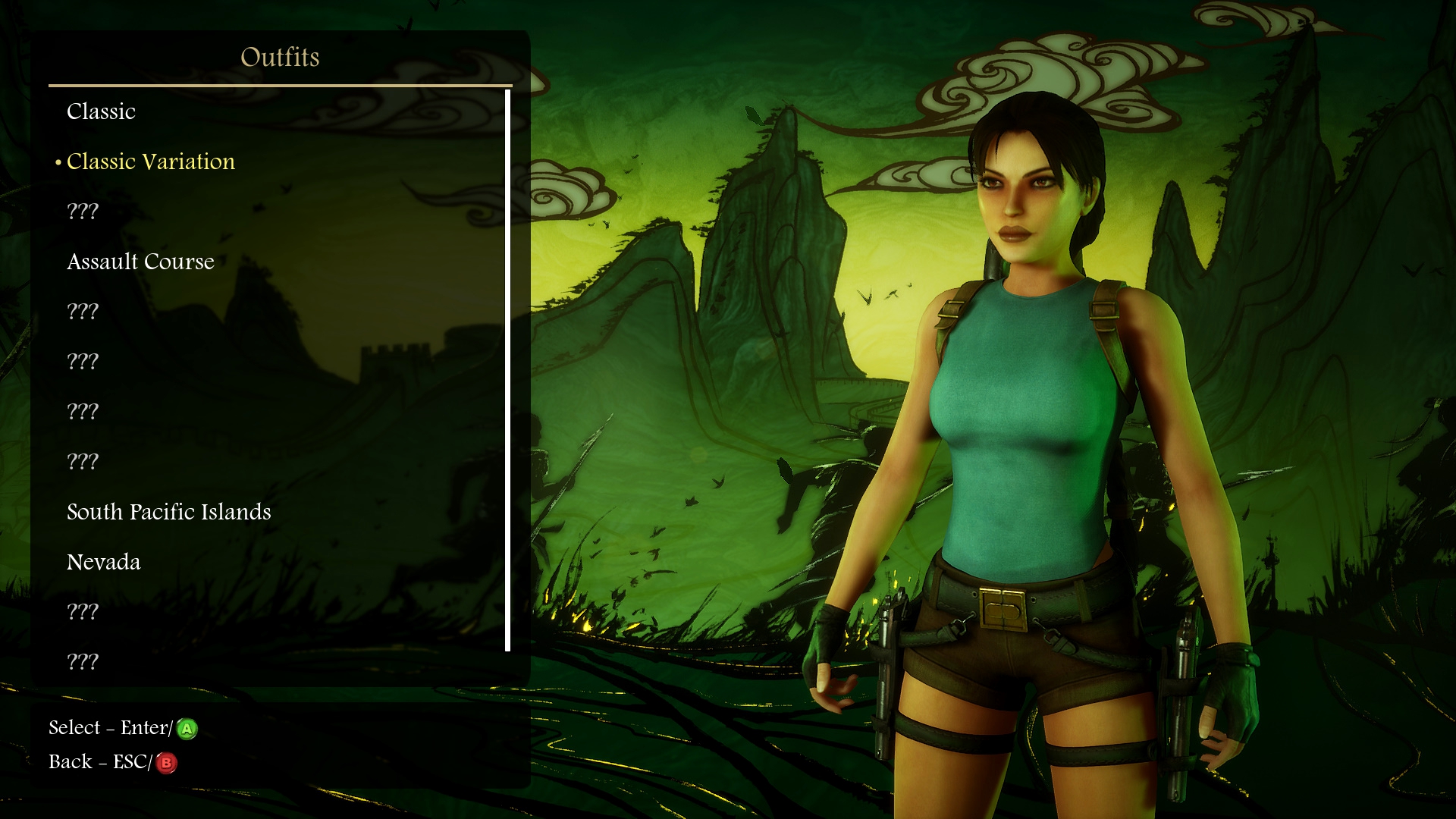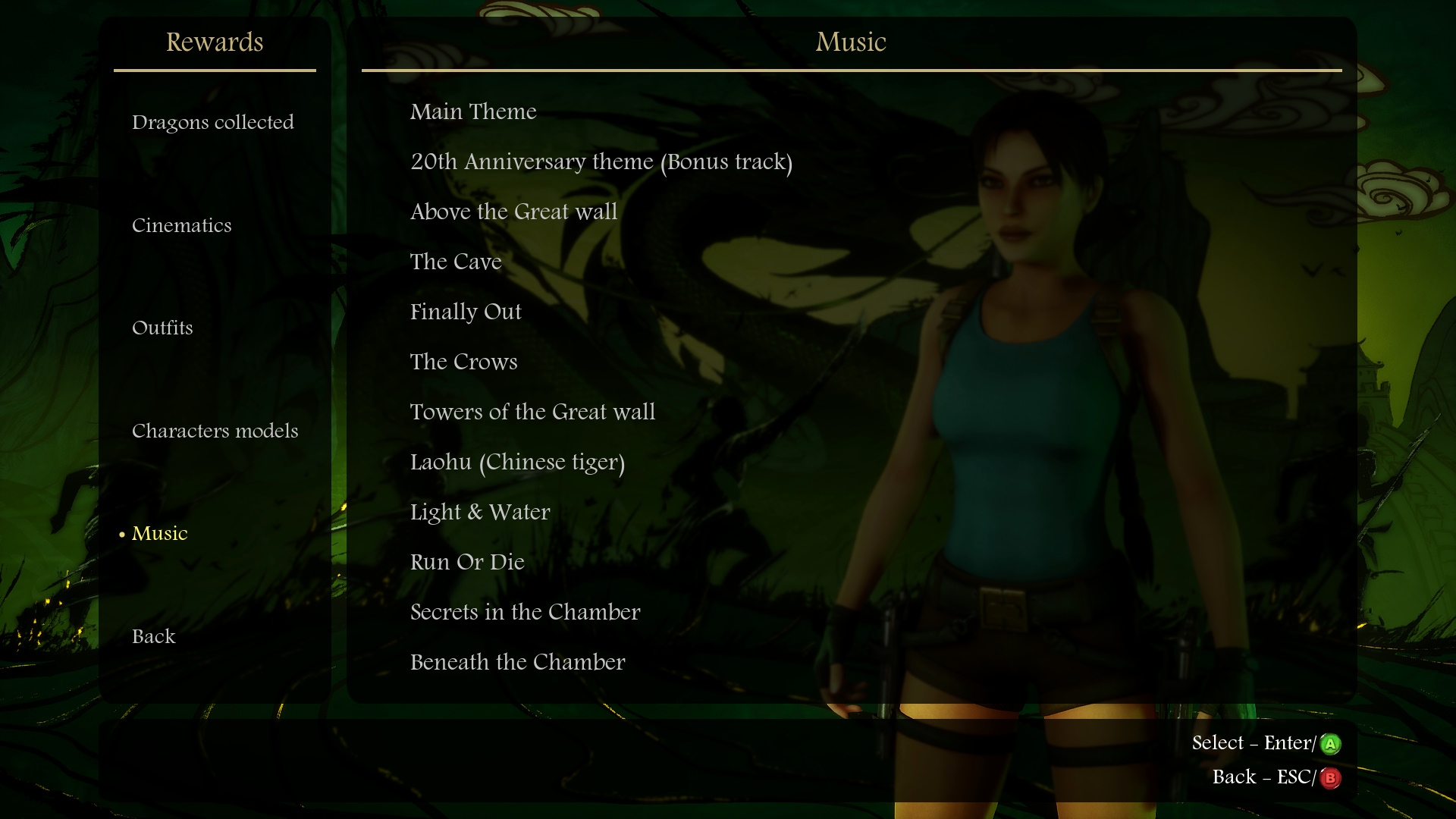Вернувшись в меню мы можем поглазеть на модельки Лары в различных костюмах, включая из других частей, а также на Уинстона и Тирранозавра. Правда всё это добавили уже с релизом патча для демо-версии, вышедшей в 2021 году. В то же время патч привнёс новые костюмы и фото-режим.