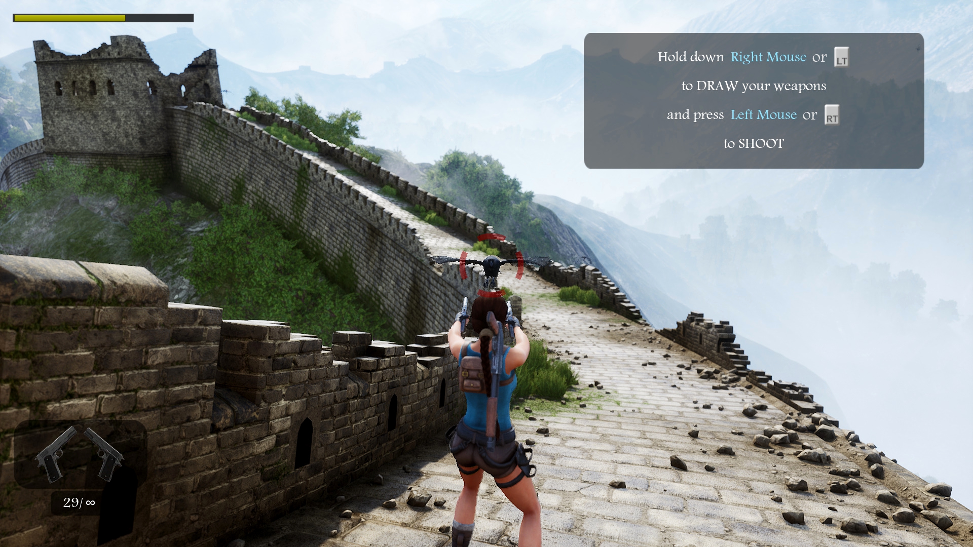 К прохождению готов только один уровень и тот обрывается на середине. Вступительного ролика про войну в древнем Китае нет, только тот, когда Лара прибывает на Великую Китайскую стену и он выполнен с точностью до пикселя! Даже очки Лары имеют красные стёкла, как и в оригинальной игре, что похвально, ведь даже на момент создания ремейка первой части ни Core Design, ни Crystal Dynamics не стали заморачиваться с этой деталью.