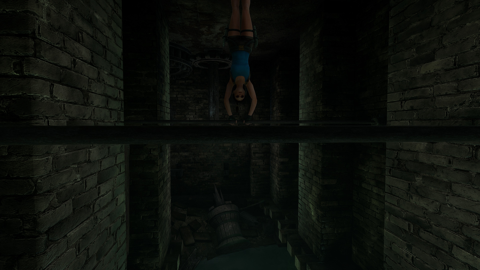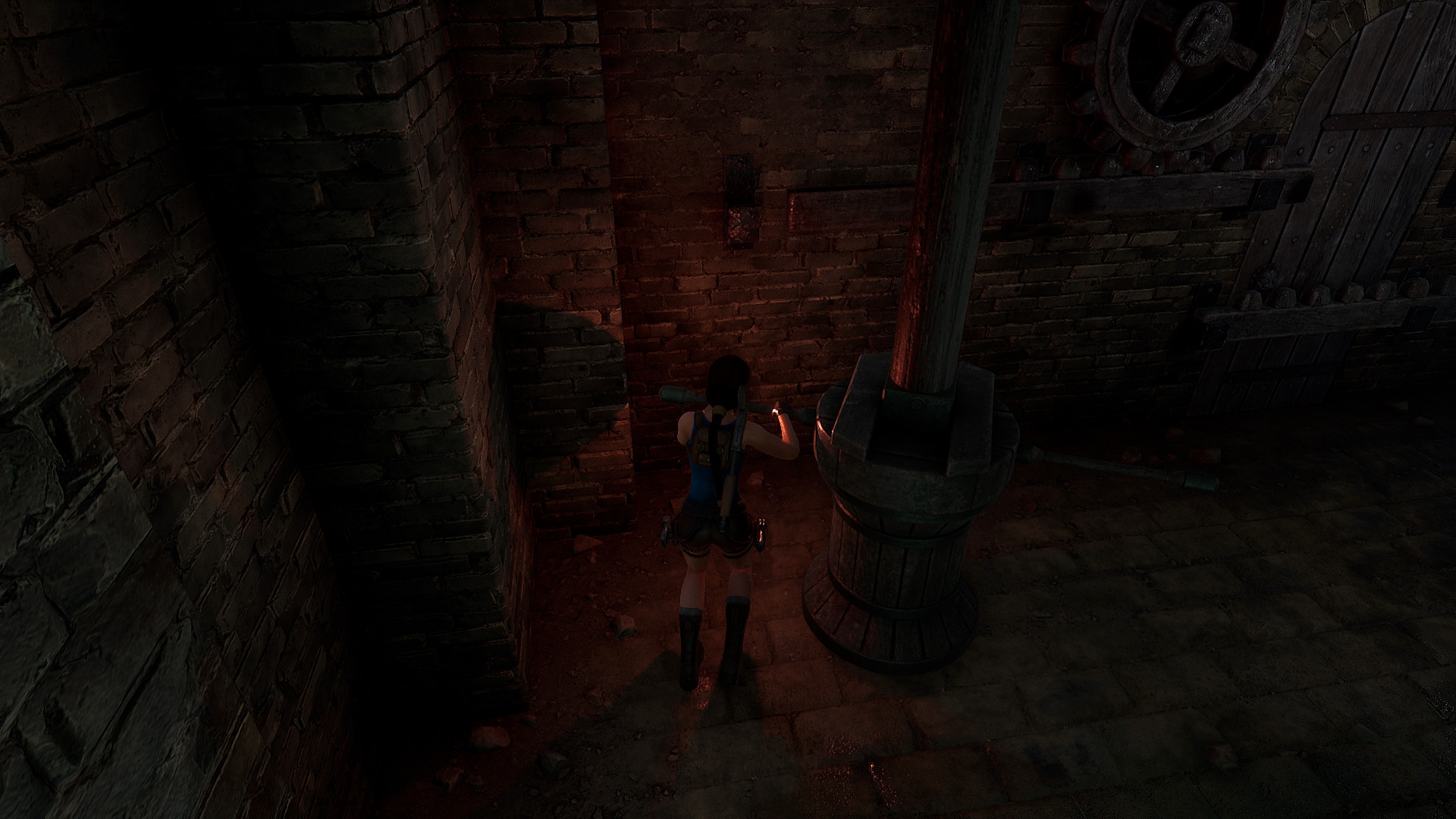 Взобравшись на стену, внутри неё ожидает первая загадка, которая полностью переделана в сравнении с оригиналом. В оригинальной игре все загадки сводились к полосе препятствий с ловушками, ведущей к рычагу, который открывает дверь. Тут, в целом, то же самое, но дверь нужно отрыть иначе и... Вроде смотрится неплохо, но с точки зрения логики она нелогична. Дело в том, что чтобы открыть дверь, Лара не запускает механизм, а ломает его и случайным образом шестерня проламывает замок двери... Сделано это по лекалам современных Tomb Raider и Uncharted, только вот даже там действия героев оправданные, а тут шестерня могла и не упасть куда надо. Увы, но первый минус демо уже заработала.