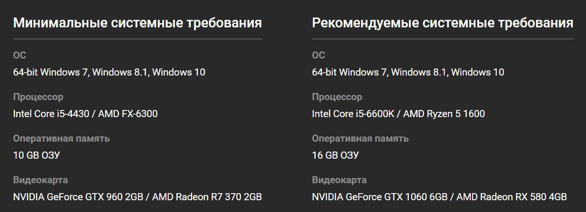Старые требования можно увидеть на скриншоте ниже. В новых требованиях GeForce GTX 1060 переместилась из рекомендуемой конфигурации в минимальную, требования к процессору также выросли.