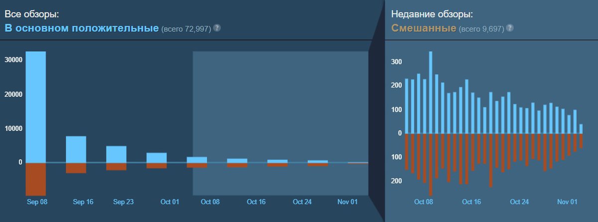 Например, 30 октября игра получила 113 положительных отзывов и 116 отрицательных отзывов. 5 октября у Starfield было 230 положительных и 151 отрицательный отзыв.
