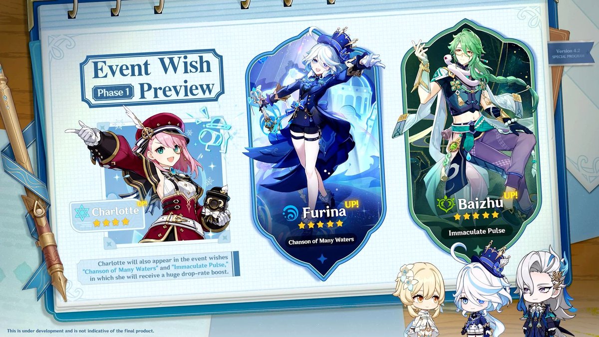 В ходе презентации обновления 4.2 разработчики Genshin Impact раскрыли частичный состав обоих баннеров патча. Следующее обновление введет в игру двух новых персонажей, Фурину и Шарлотту, а также запустит рераны трех героев с 5 звездами редкости.
