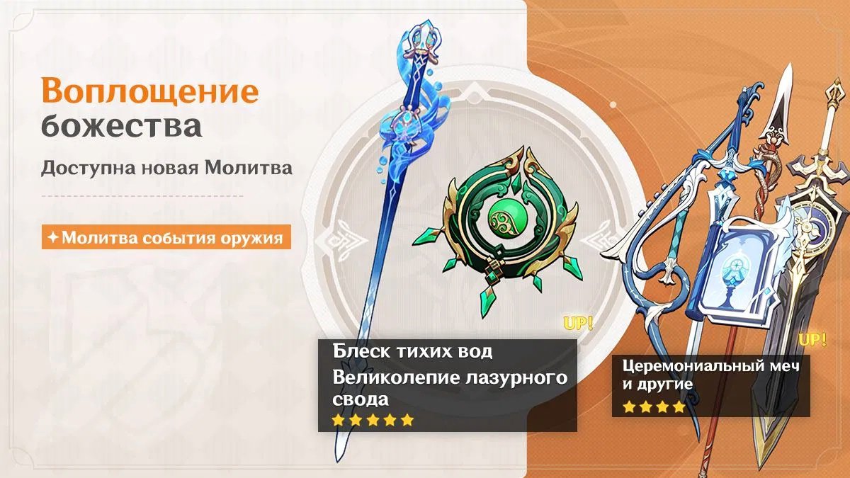 За пару дней до релиза обновления 4.2 разработчики опубликовали состав первого оружейного баннера. Игроки смогут получить Блеск тихих вод и Великолепие лазурного свода, а также несколько «пушек» с 4 звездами редкости.