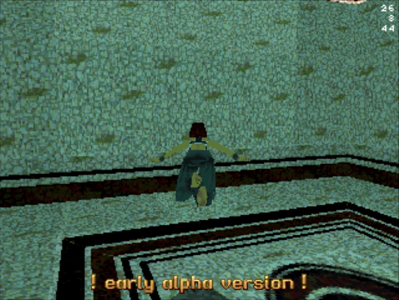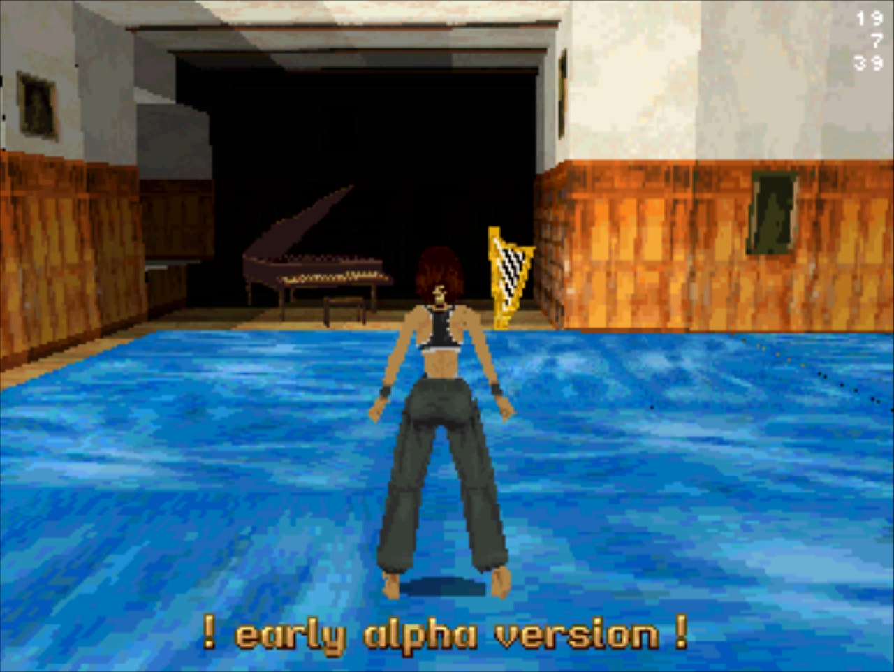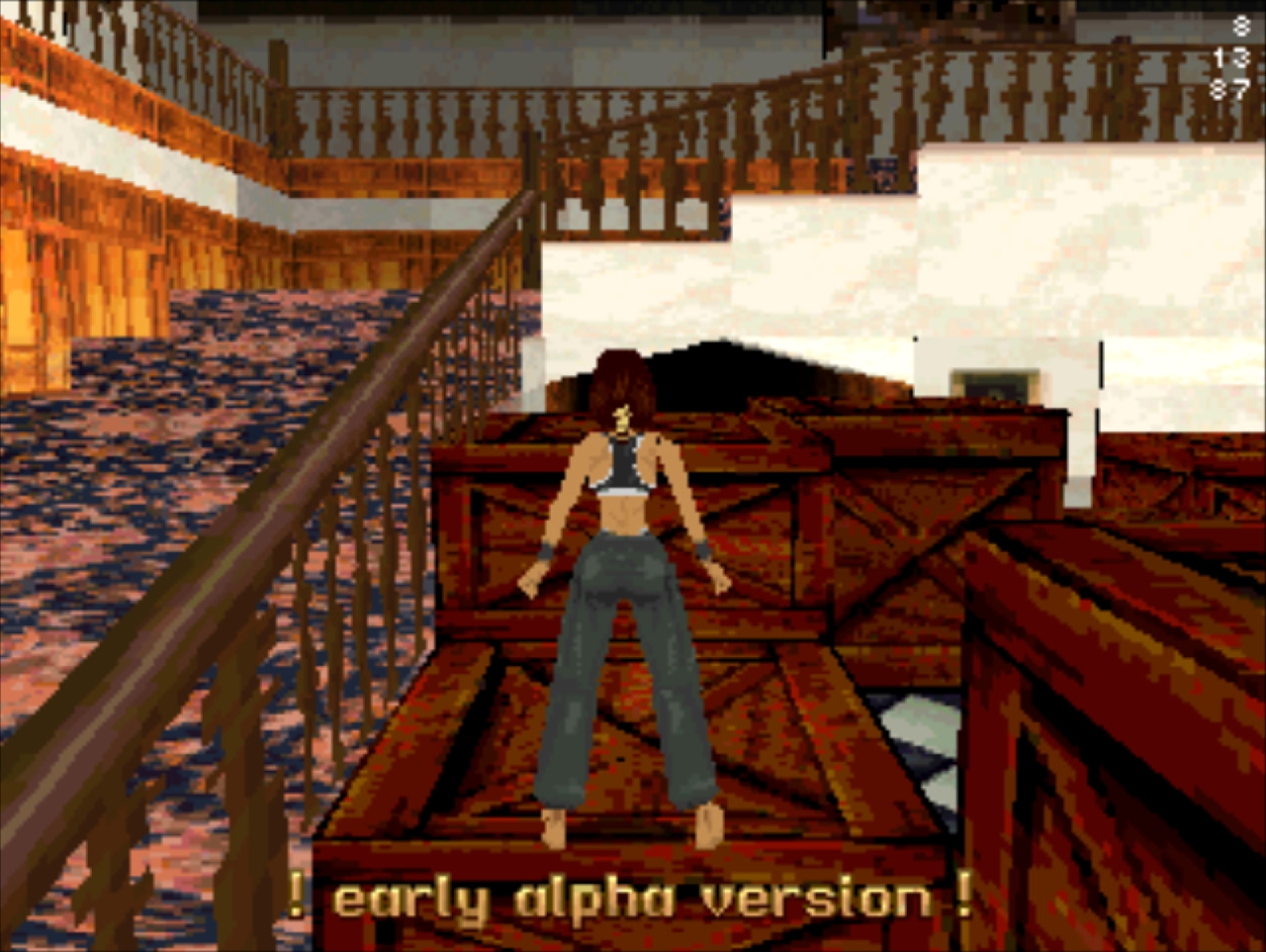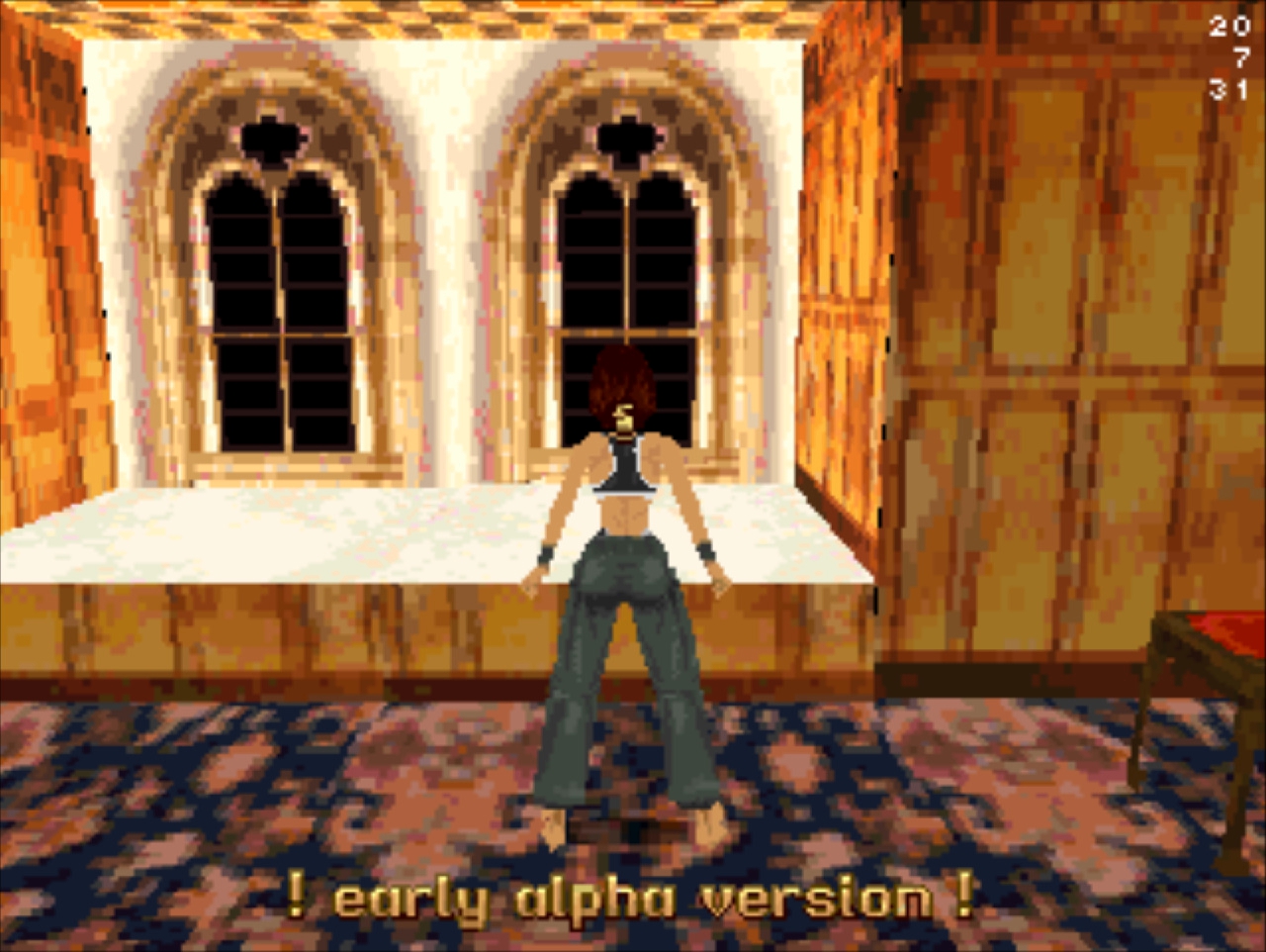 Демо-версия не имеет роликов и меню, стартует сразу же с особняка Лары и... Глядя в пустое окно (эффект свечения и текстуру порезали), частота кадров не поднимается выше 20... Мда, уже понятно с чем имеем дело. Развернувшись можно понять, что и дальность прорисовки тоже порезана, так как в секции с гимнастическими матрасами пианино скрыто в чёрном дымке. А выйдя в холл особняка весь энтузиазм на полный порт игры угасает, так как там игра упала до 8 кадров. Сама Лара также порезана, у неё в модельке не хватает некоторых частей. Что касается воды, то в отличие от GameBoy Advance порта тут эффект прозрачности и воды сохранён.