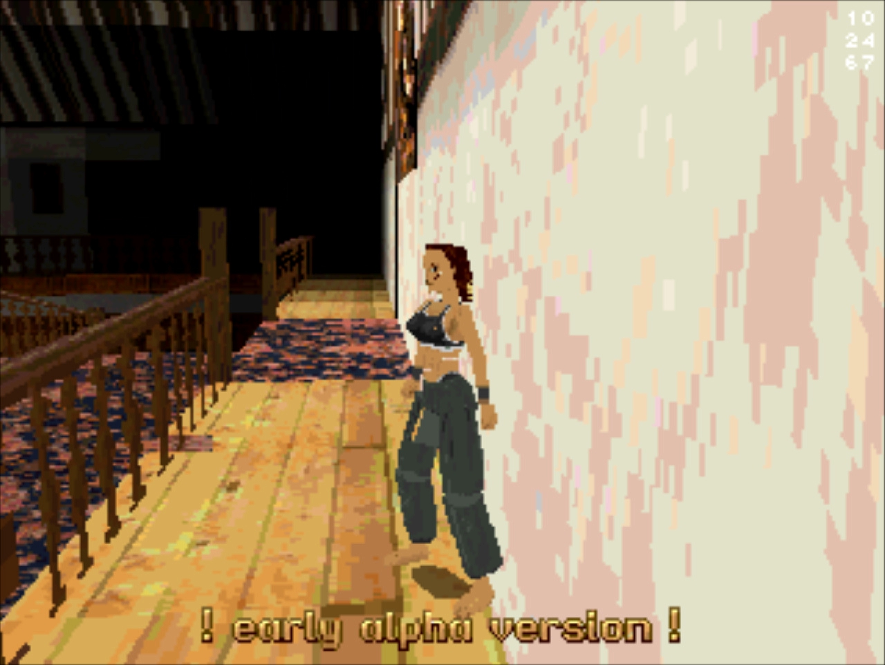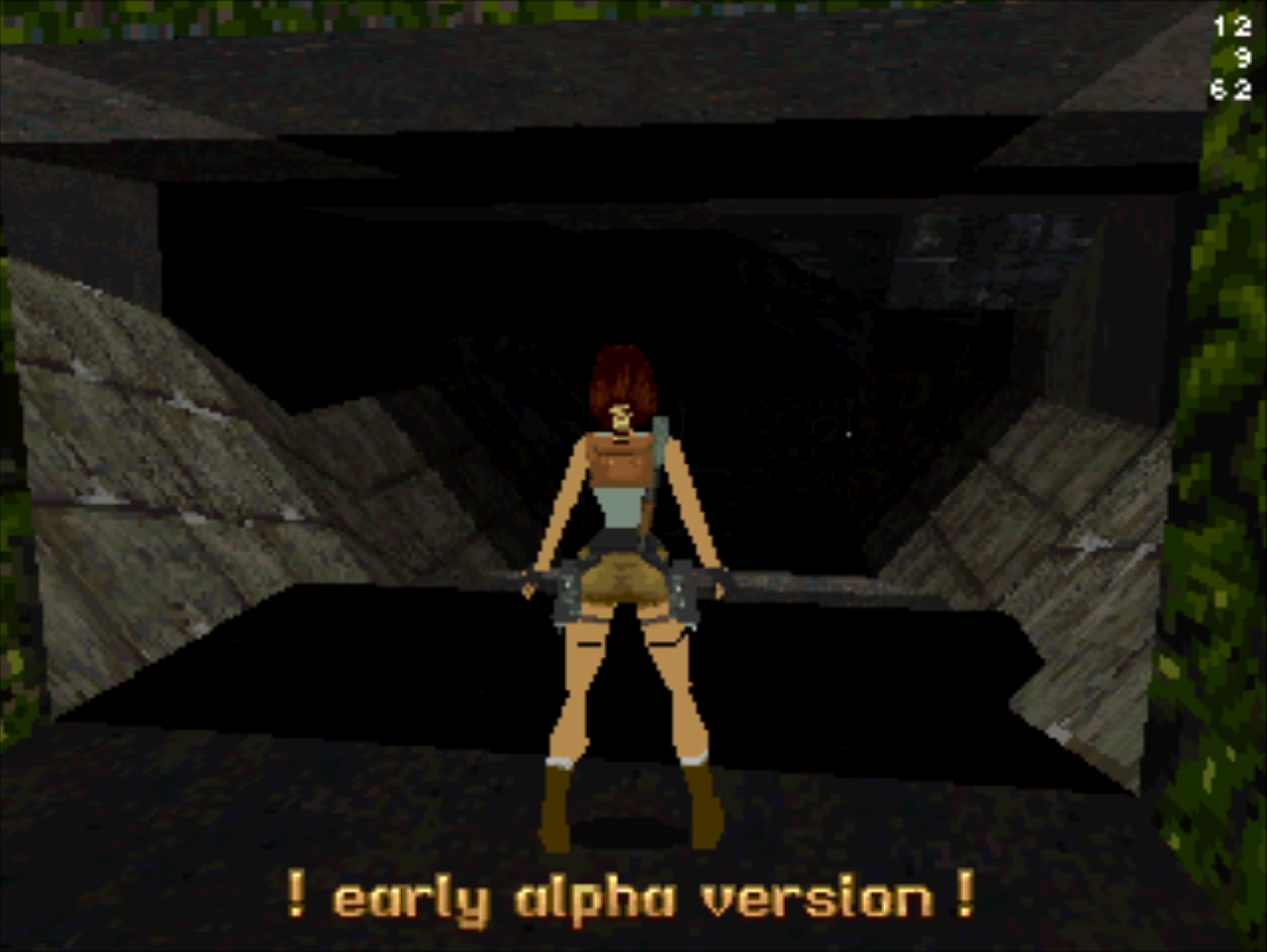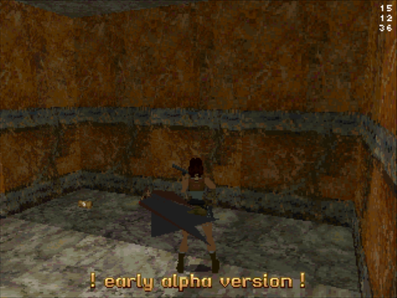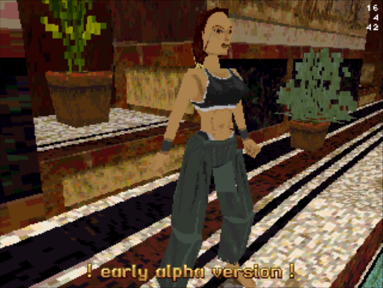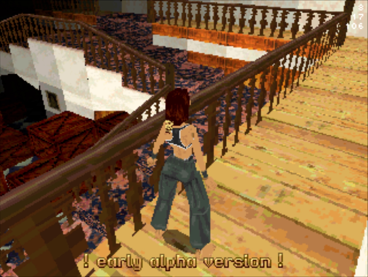Демо-версия не имеет роликов и меню, стартует сразу же с особняка Лары и... Глядя в пустое окно (эффект свечения и текстуру порезали), частота кадров не поднимается выше 20... Мда, уже понятно с чем имеем дело. Развернувшись можно понять, что и дальность прорисовки тоже порезана, так как в секции с гимнастическими матрасами пианино скрыто в чёрном дымке. А выйдя в холл особняка весь энтузиазм на полный порт игры угасает, так как там игра упала до 8 кадров. Сама Лара также порезана, у неё в модельке не хватает некоторых частей. Что касается воды, то в отличие от GameBoy Advance порта тут эффект прозрачности и воды сохранён.