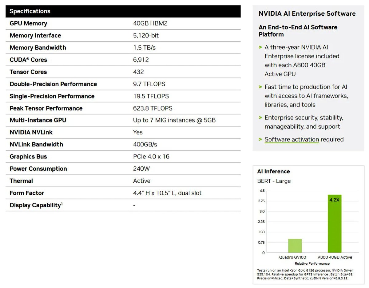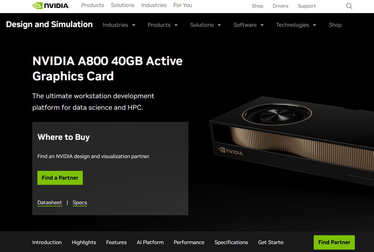 Как отмечает Tom's Hardware, страница ускорителя A800 уже появилась на западном сайте Nvidia. В промо-материалах компания отмечает, что «новый» ускоритель гораздо быстрее Quadro GV100.