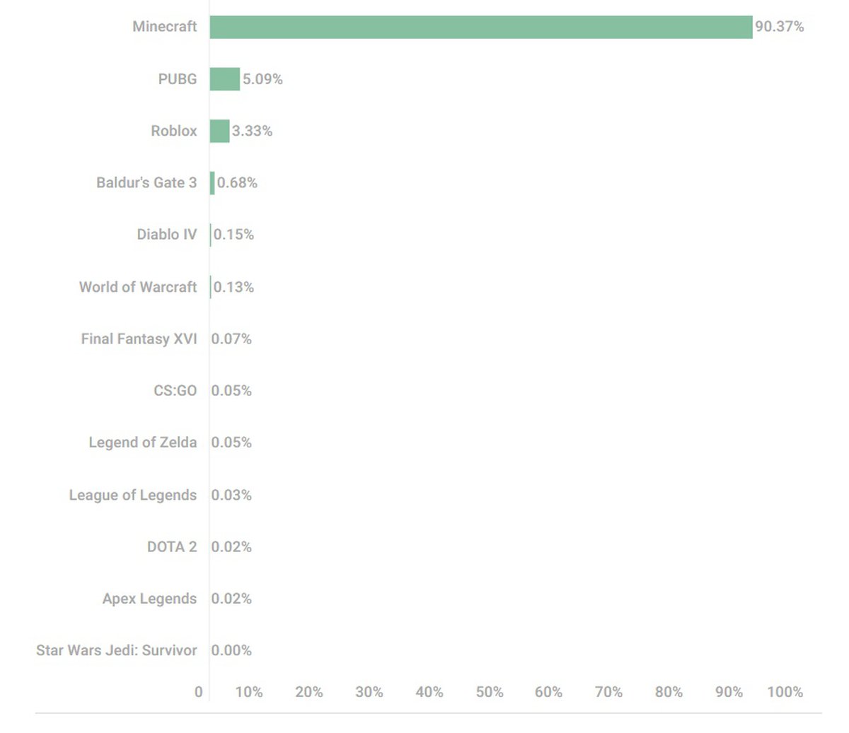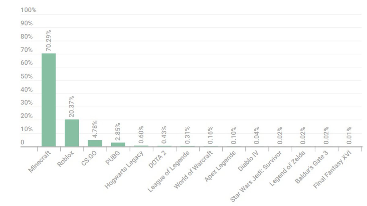 Второе место занимают игроки в Roblox, основного конкурента Minecraft: на них ориентировано 20% угроз. Для сравнения: на игроков в Counter-Strike Global Offensive (исследовались данные до выхода Counter-Strike 2) ориентировано только 5% угроз.