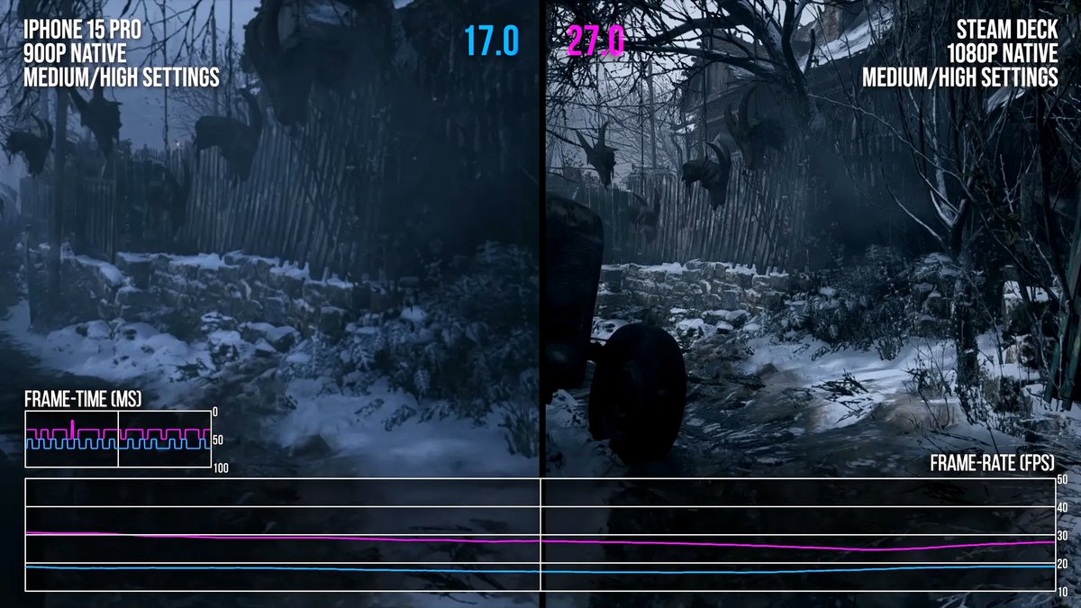 По игровой производительности, прикидывают в Digital Foundry, iPhone 15 Pro уступает Steam Deck, причем довольно заметно. Все выглядит так, словно в первую очередь частота кадров проседает из-за низкой производительности CPU.