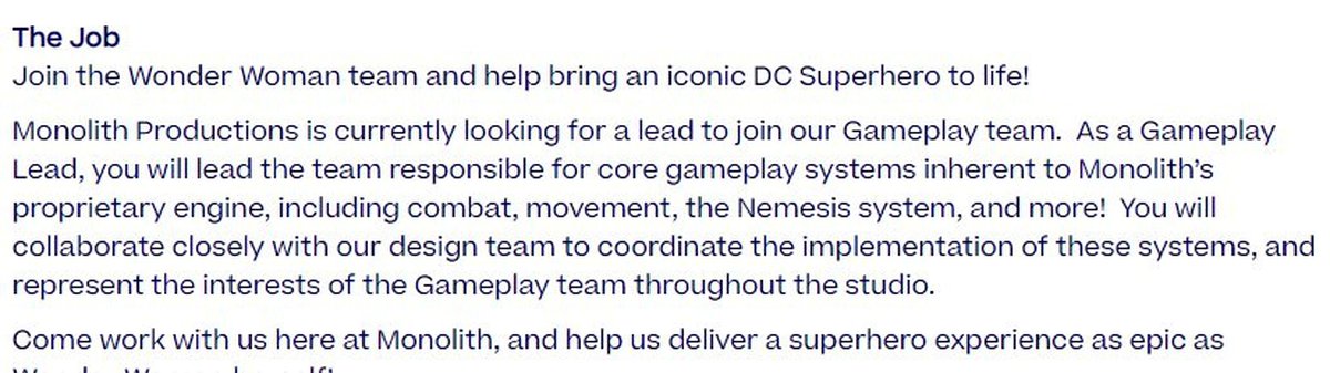 Экшен Wonder Woman от Monolith Productions и WB Games может оказаться игрой-сервисом. На это, считают фанаты, указывает вакансия ведущего дизайнера геймплея: среди преимуществ для соискателей упоминается опыт работы над играми-сервисами.
