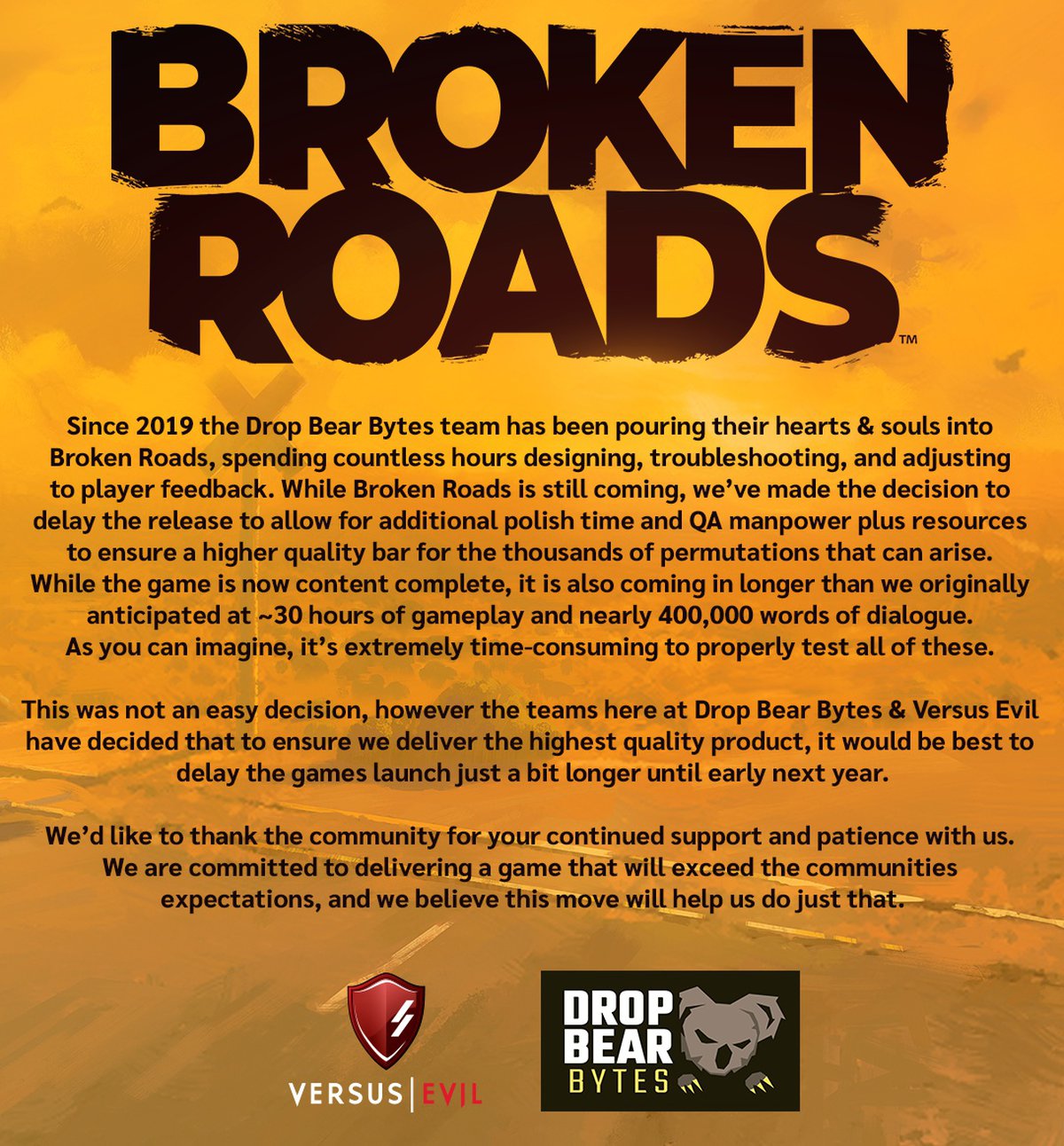 Австралийская постапокалиптическая партийная RPG с системой морального компаса, Broken Roads, в этом году не выйдет. Вчера от разработчиков пришло следующее сообщение.