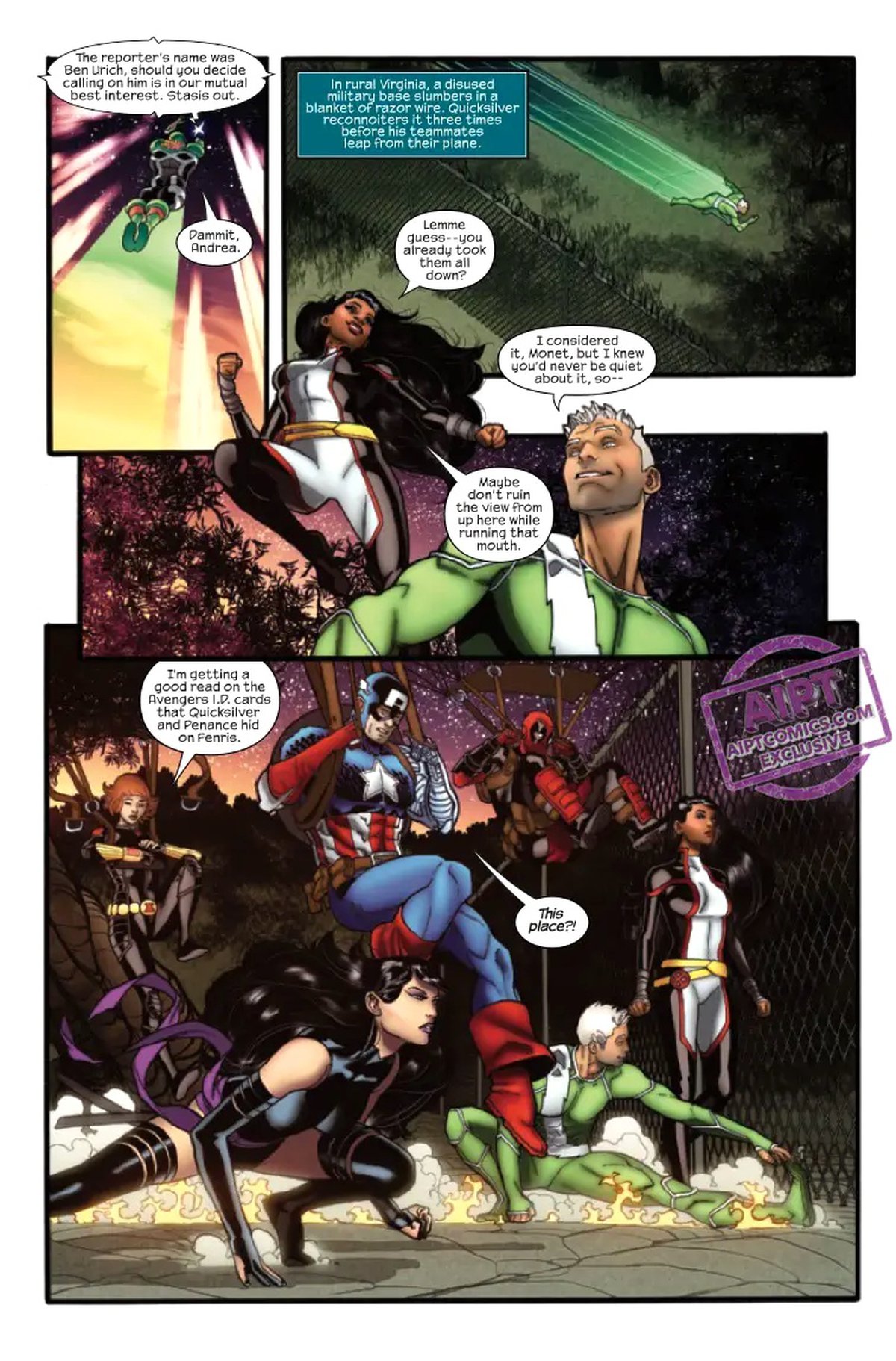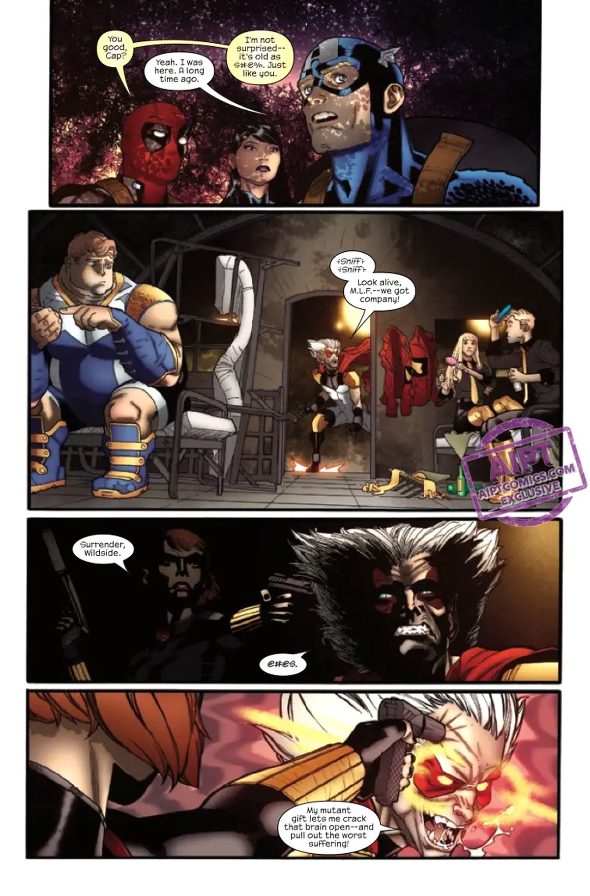 Роджерс вспоминает, что бывал в этом месте. Члены Фронта обнаружили нарушителей, но Вдова успела залезть внутрь по стелсу. Впрочем, Вайлдсайд не боится пули в лоб или затылок благодаря своим способностям.