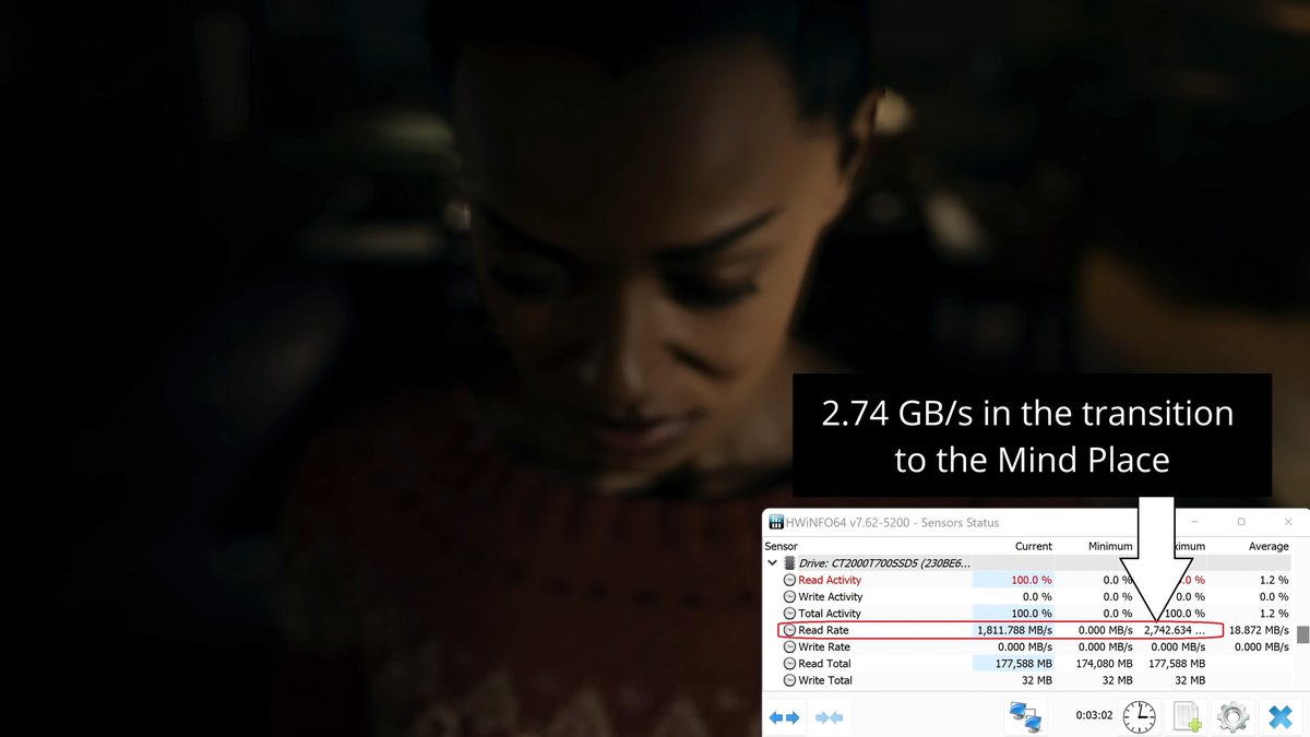 Во время прогулки по игровым локациям Alan Wake 2 время от времени загружала данные со скоростью несколько гигабайт в секунду. Максимальное значение, зафиксированное в ходе теста, достигло 2.74 гигабайта в секунду.