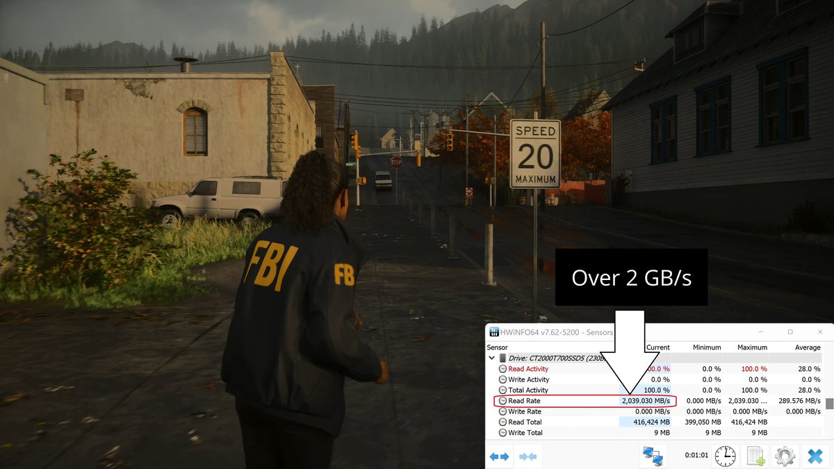 Были и исключения. К примеру, в ходе исследования Брайт-Фоллс Alan Wake 2 иногда могла загружать с накопителя около 2 гигабайт данных в секунду.