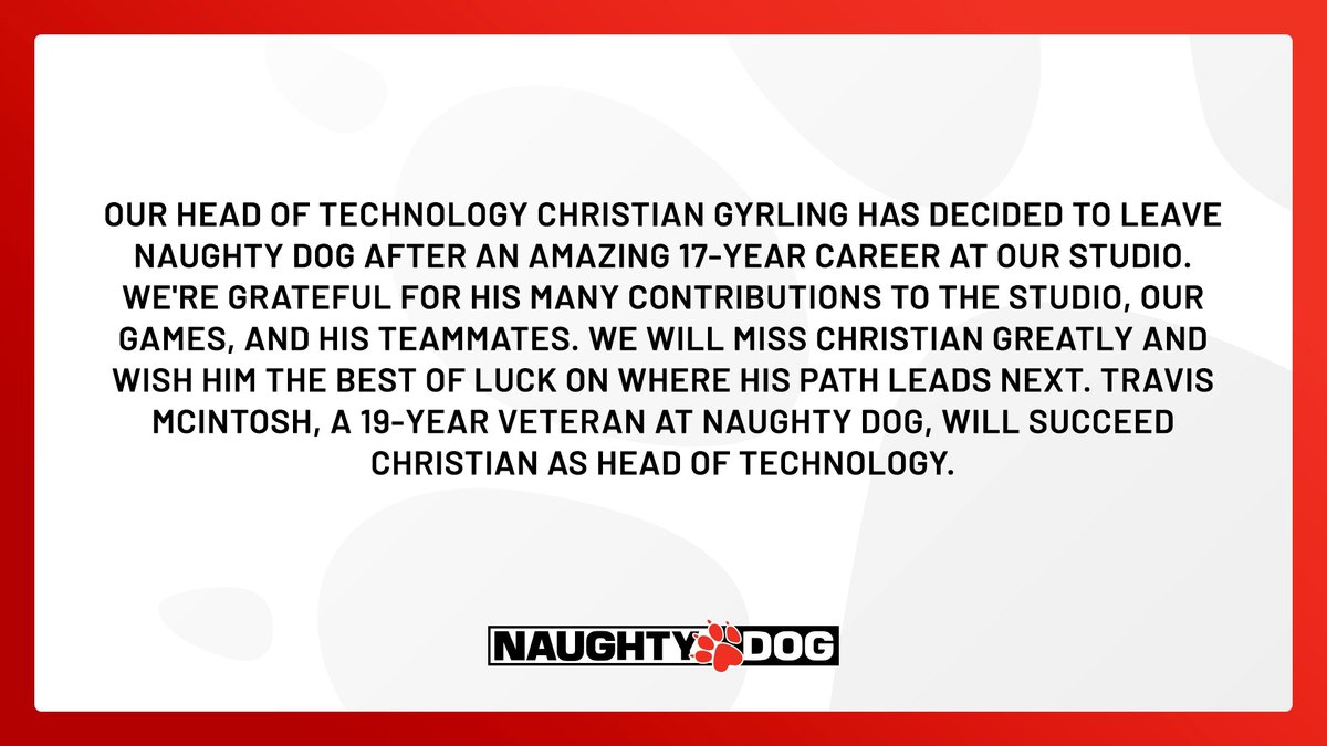 О причинах ухода Герлинга из Naughty Dog не сообщается. Преемником Кристиана станет Трэвис Макинтош, еще один ветеран студии: он работает в Naughty Dog уже 19 лет.