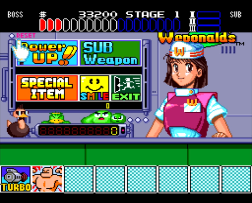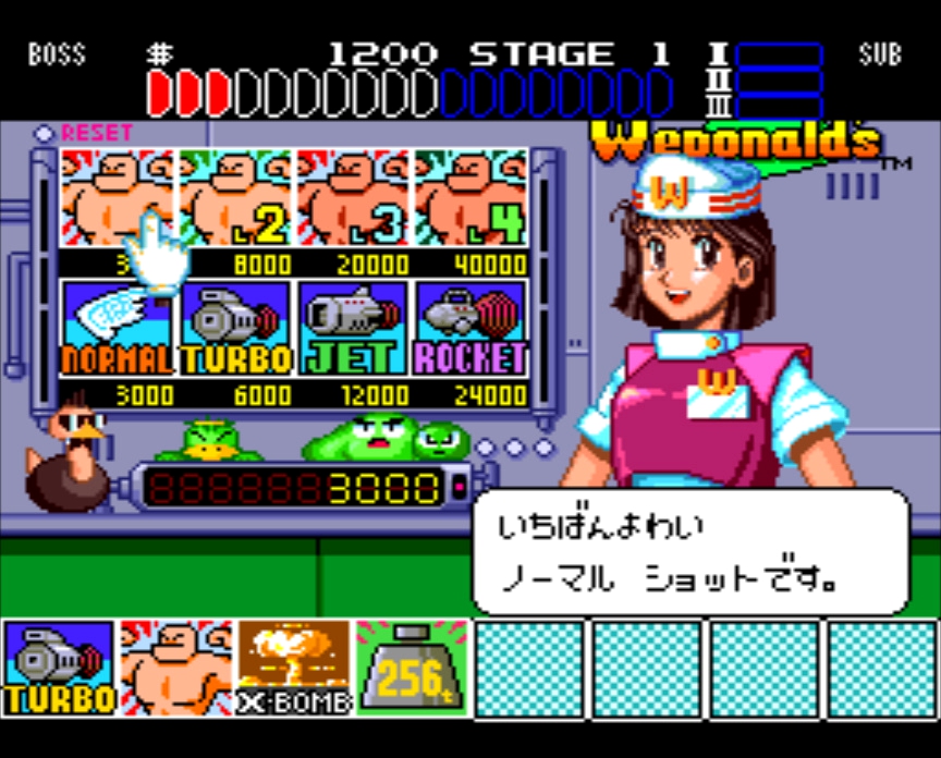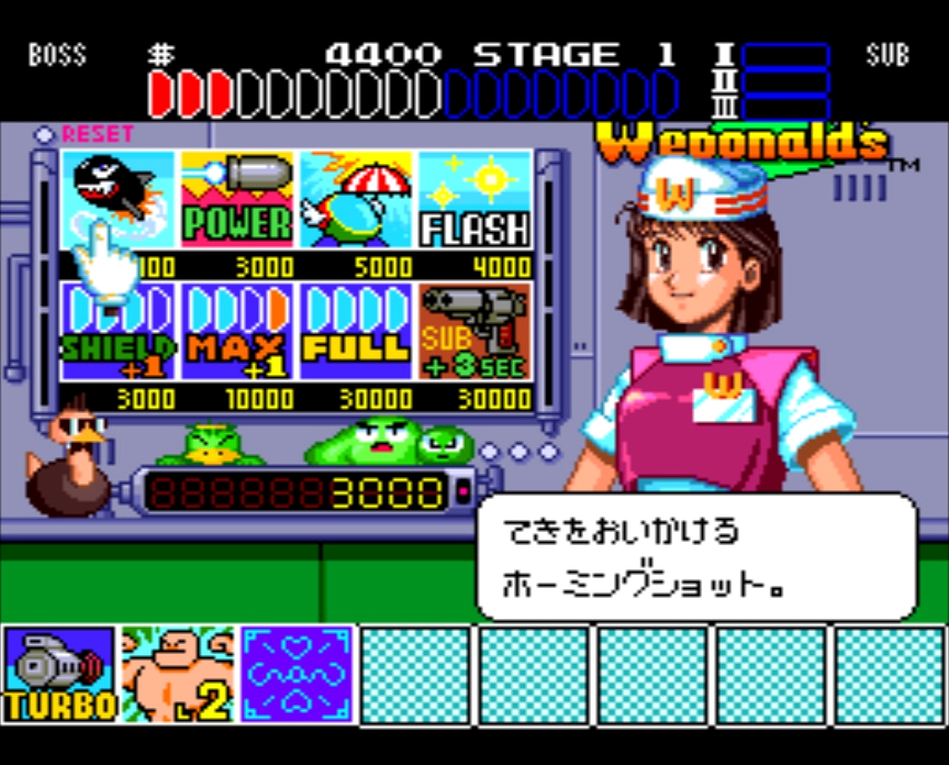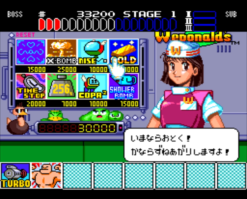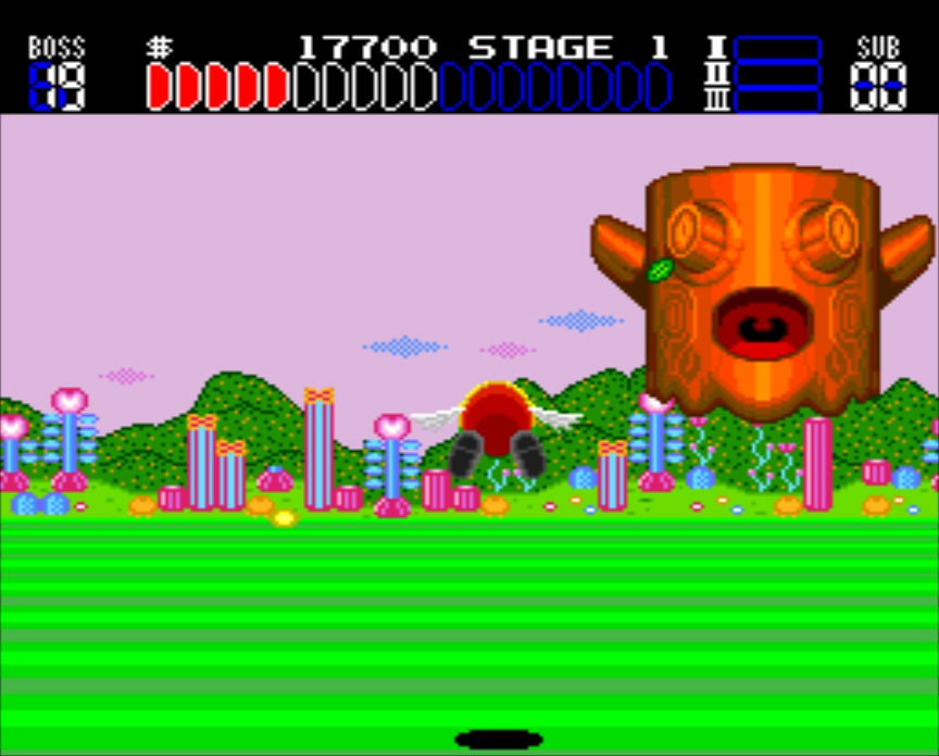 Играть нам предлагают за Опа-Опа, героя игры Fantasy Zone. Враги и музыка – это микс игр серий Fantasy Zone и Space Harrier. Проще говоря, для тех, кто не играл в перечисленные игры (я тоже не играл) – это леталка-стрелялка с магазином прокачки. Игра до чёртиков сложная, но очень смешная в оформлении... Вот где ещё можно увидеть летающий пенёк, стреляющий листьями?! К сожалению, здоровье восстанавливать нельзя, игру нужно пройти в один заход, изредка покупая улучшения в магазине. Деньги для магазина зарабатываются путём уничтожения врагов на экране и чем больше врагов положили – тем больше заработали. У меня с подобными играми всегда проблема, поэтому ушел не дальше второго уровня, однако игра выглядит вполне готовой к релизу.