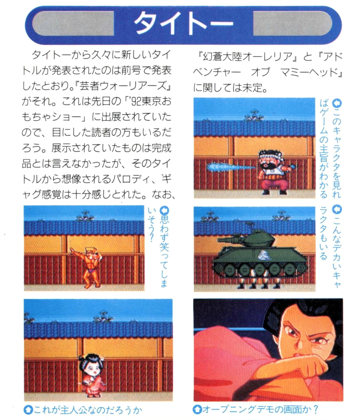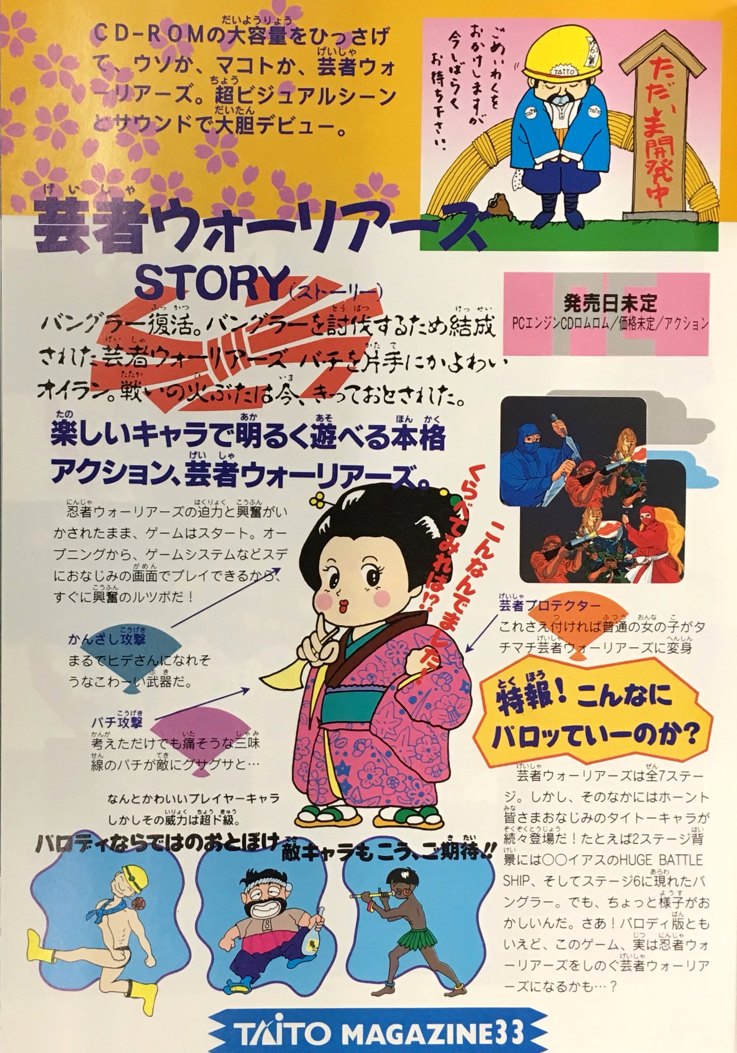 Что будет, если Рю Хаябусу из Ninja Gaiden нарядить в кимоно? Получится пародийная игра Geisha Warriors от кампании Taito! Игру планировали выпустить в 1993 году, но что-то пошло не так. Различные журналы указывали, что игра была очень весёлой и имела даже видеовставки! Но, отмена игры произошла тихо и без видимых на то причин. Прототипа у игры также нет, увы.