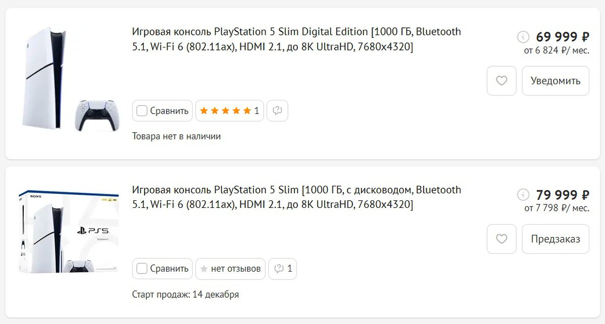 Новые модели PlayStation 5 поставляются в Россию по параллельному импорту, корпорация Sony перестала официально работать с местным рынком. В США за PlayStation 5 Slim без дискового привода просят $450, версию с приводом оценили в $500.