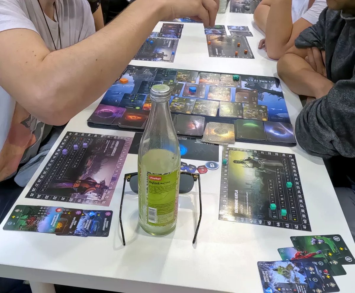 В описании настолки про дипломатию ничего не сказано. Максимальное число игроков 6. В рамках одной партии предстоит побывать на 7 планетах, в поисках ценных ресурсов и технологий, сражаясь с враждебными отрядами и захватывая достопримечательности. В принципе это недалеко от сути оригинала, только в настолке на каждой планете можно провести по две экспедиции всего, и подаётся всё через карточки.