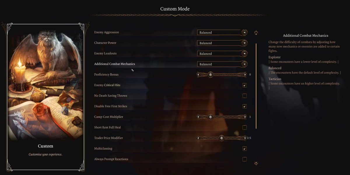 - Добавлена возможность создать собственный уровень сложности, настраивая массу параметров. К примеру, можно сделать так, чтобы короткий отдых полностью исцелял отряд или включить скрытие здоровья врагов в бою.