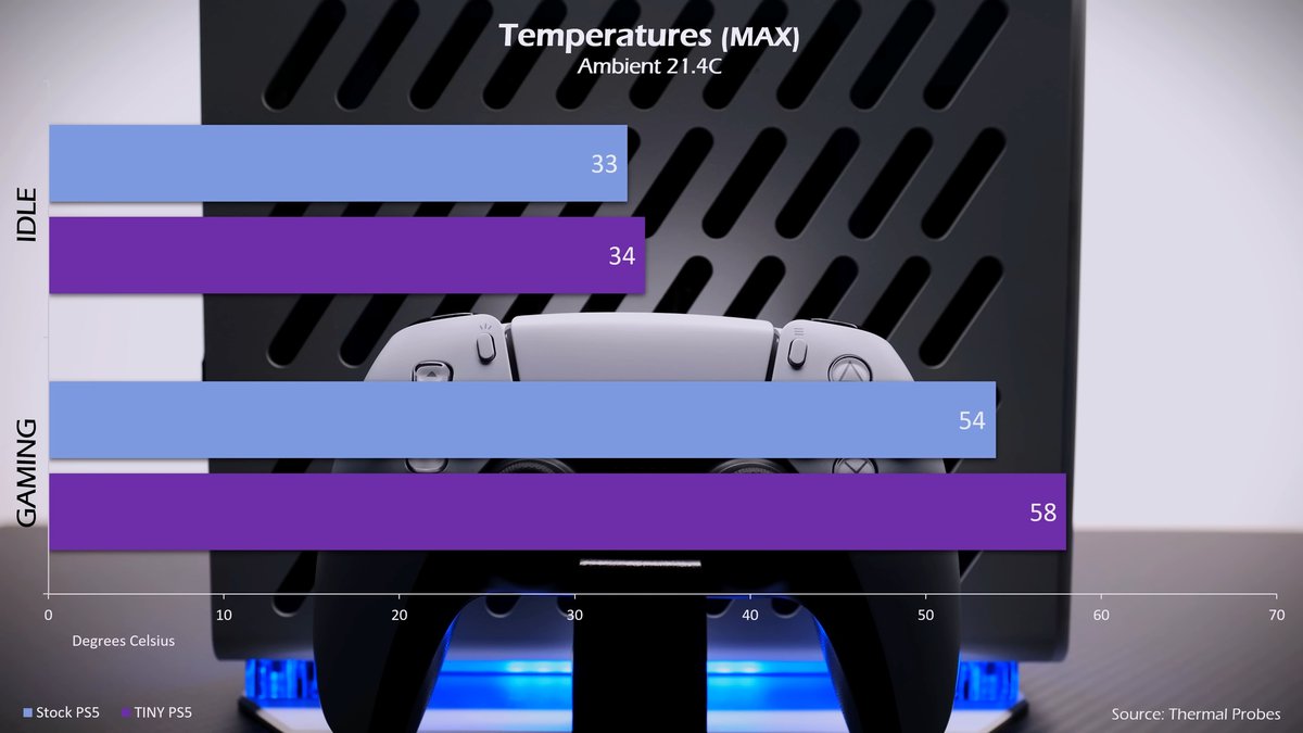 Благодаря новому вентилятору и радиатору PlayStation 5 неплохо чувствует себя и в компактном корпусе. Под нагрузкой консоль разогревается максимум до 58 градусов Цельсия, это на 4 градуса выше, чем показатель обычной PlayStation 5.