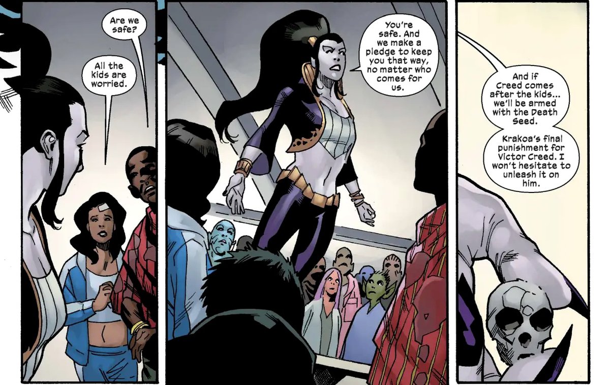 Бенджамин: Всё, что сказал Виктор. Плюс вот что: Саблезубого бросили в яму в комиксах House of X/Powers of X. Мы намеренно убрали его с кракоанской сцены. Викторы (ЛаВалль и Крид) делали своё дело в отдельных сериях, но всё это было очень-очень далеко от Росомахи. Таким образом, мы создали его закулисную мифологию и усилили напряжение, так что, когда эти два соперника наконец встретятся лицом к лицу, это будет взрывоопасно.