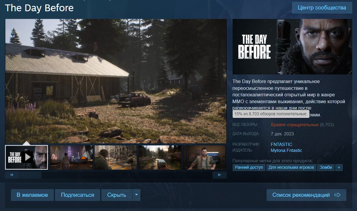 Теперь недовольные игроки массово публикуют отрицательные отзывы в Steam. На момент публикации этого текста у The Day Before больше 8700 отзывов, только 15% из них положительные; статистика еще не обновилась, но игра явно займет 2 или 3 место в топе самых низкорейтинговых проектов в Steam.