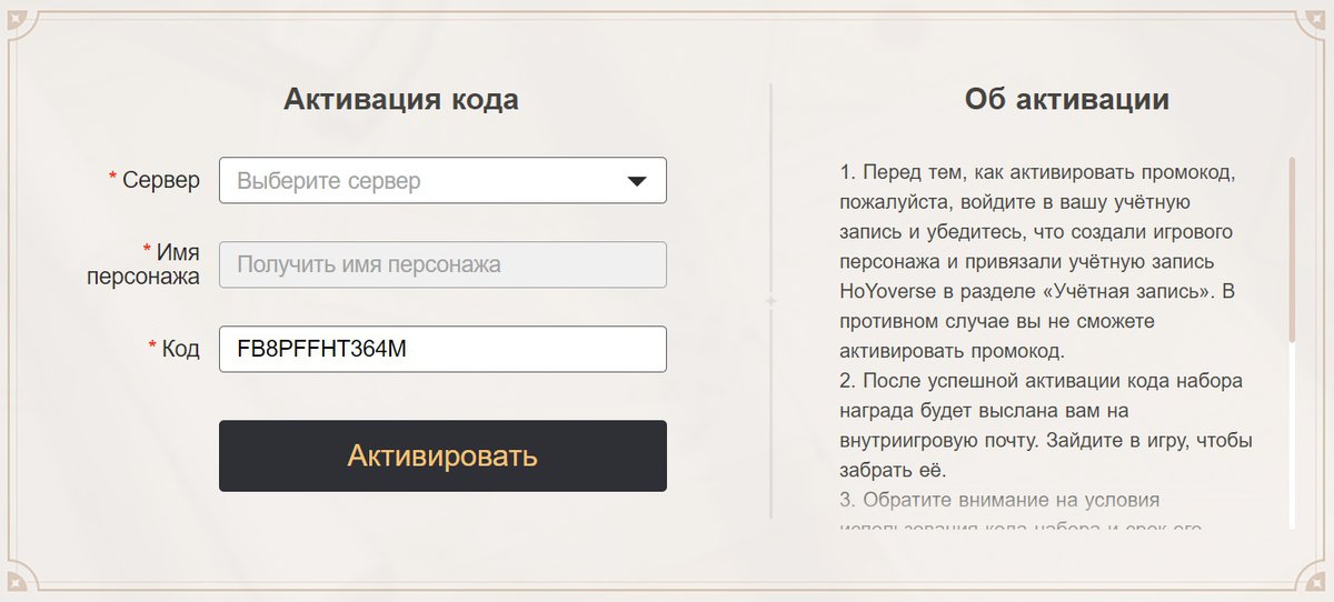 Во-вторых, код можно активировать в специальном разделе на сайте игры. В этом случае ресурсы также придут на внутриигровую почту персонажа.