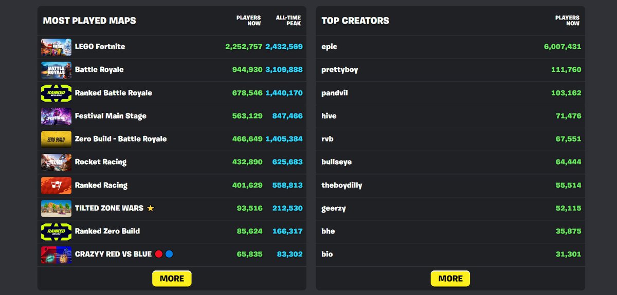 Хотя Королевская битва все еще лидирует по абсолютному пиковому онлайну (3.1 миллиона человек), в последние дни онлайн в режиме не поднимался выше 1 миллиона человек. По всей видимости, часть аудитории отправилась исследовать LEGO Fortnite.