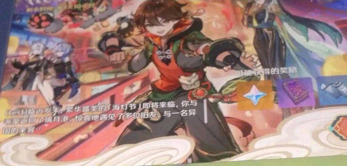 Предполагается, что персонаж на переднем плане это Мальчик-лев. Если верить более ранним сообщениям инсайдеров, у этого героя может быть 4 звезды редкости. Справа от него можно заметить Хранителя Облаков, слева — новые облики Шэнь Хэ и Гань Юй.