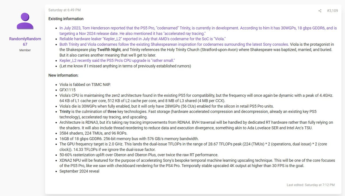 Таким образом инсайдер прокомментировал слухи об утечке полной конфигурации улучшенной консоли. Предполагаемые характеристики PlayStation 5 Pro опубликовали на форуме ResetEra, автор не стал подтверждать свои слова.