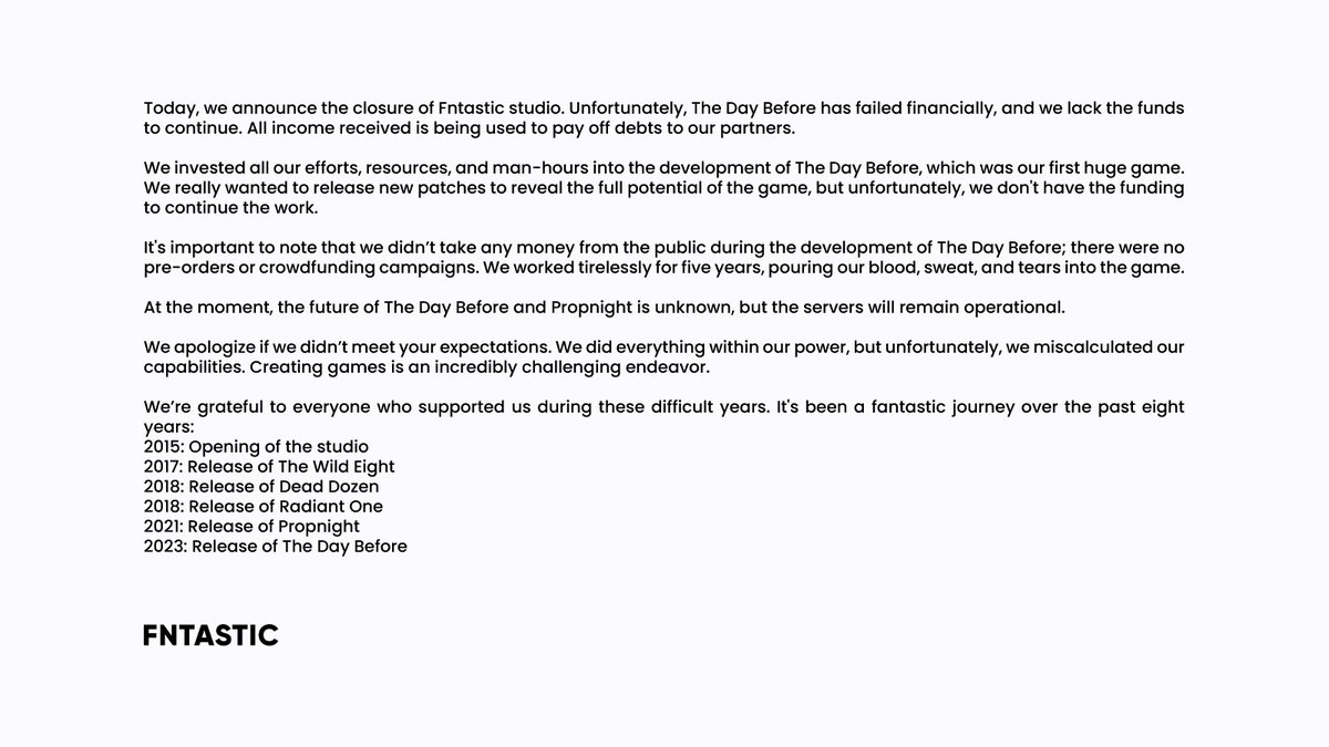 Сервера The Day Before и Propnight, другого проекта Fntastic, продолжат работу. В студии не знают, какая судьба ждет проекты.