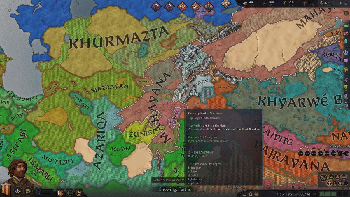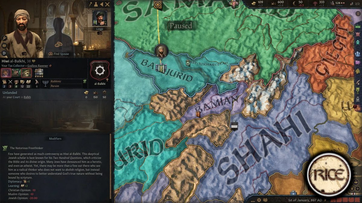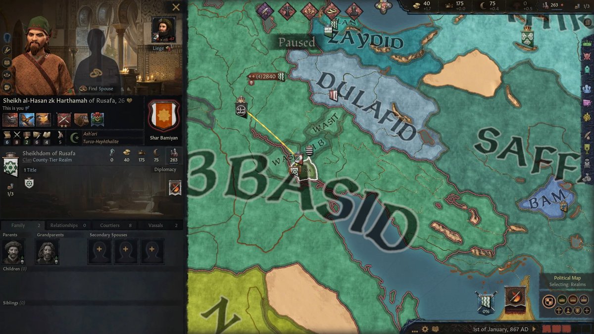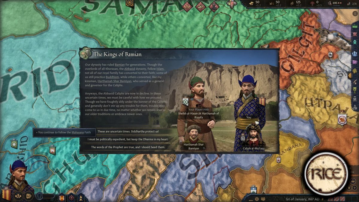 Переходим к персонажам. Сначала 867 года. Но тут не всё так просто. В масштабах игры Бамианская долина маленькая, но у её правителя есть родственники, управляющие другими землями. Например, Шейх Аль-Хасан, сын Хартама аббасидского наместника Йемена. В 870-ых годах он исторически должен помогать Аббасидам подавлять восстание рабов, привезённых из Африки. Аль-Хасан - мусульманин.