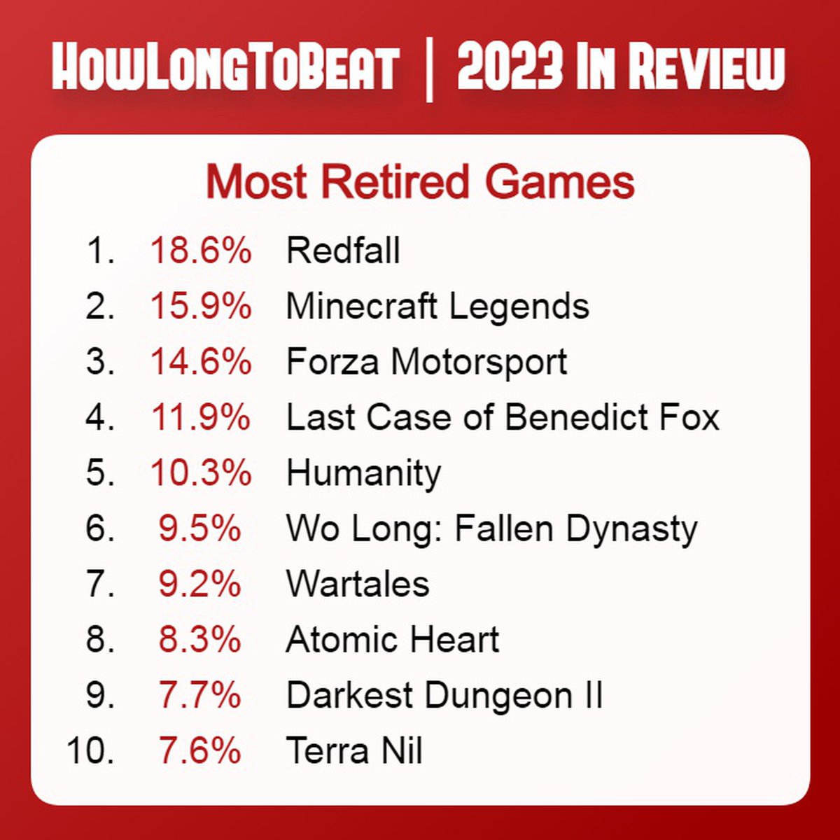 Лидером своеобразного антирейтинга стала Redfall от Arkane Studios: ее бросили 18.6% игроков, собиравших данные через How Long To Beat. Также в топ попали стратегия Minecraft Legends и гоночный симулятор Forza Motorsport.