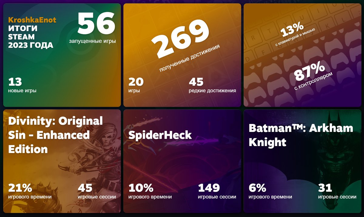 Раздел расскажет о количестве опробованных игр и назовет самые любимые проекты. Например, вот так выглядит отчет KroshkaEnot — похоже, Steam выкладывает в открытый доступ страницы игроков, расшаривших прошлогодние отчеты.