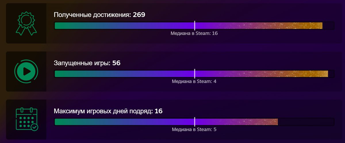 Также на странице собраны данные о том, как кое-какие цифры из статистики игрока соотносятся со всем игровым сообществом Steam. Для некоторых игр будет выведены не только списки полученных достижений, но и распределение игрового времени по месяцам.