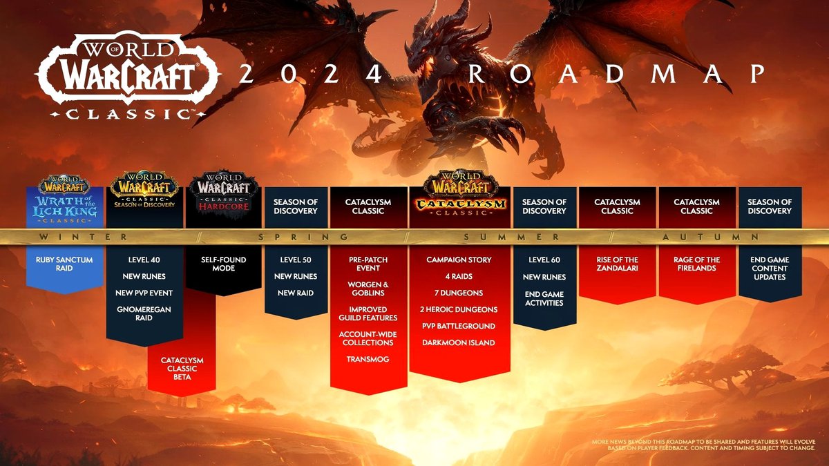 Также была опубликована дорожная карта классических серверов World of Warcraft. Здесь к запуску готовится дополнение Cataclysm: Смертокрыл появится на классических серверах летом 2024 года, препатч стартует весной.