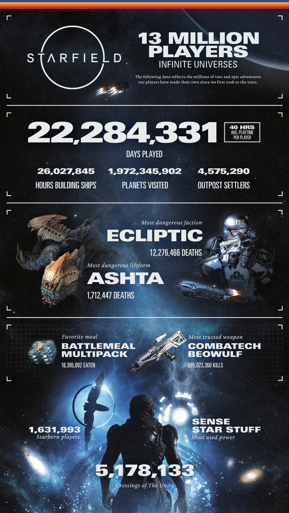 Bethesda Game Studios опубликовала инфографику, посвященную приключениям игроков в Starfield. К моменту публикации аудитория игры достигла 13 миллионов человек, но число проданных копий ниже: Starfield есть в подписке Game Pass.