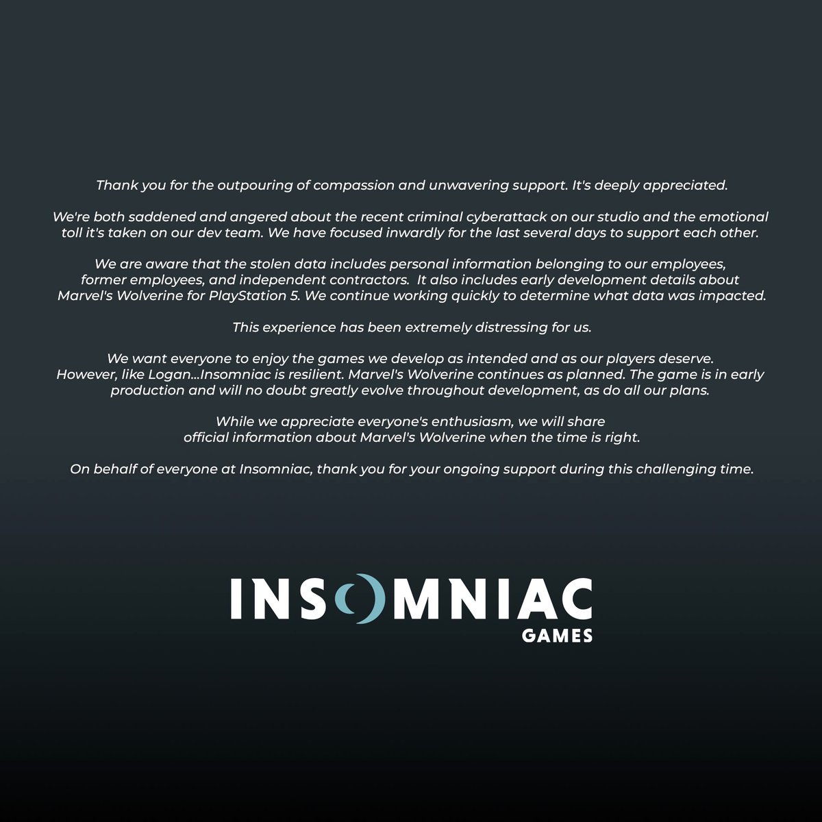 Также студия прокомментировала статус Wolverine, своей следующей крупной игры; в утечке есть ее играбельный билд. По словам сотрудников Insomniac Games, сейчас проект находится на ранней стадии разработки.