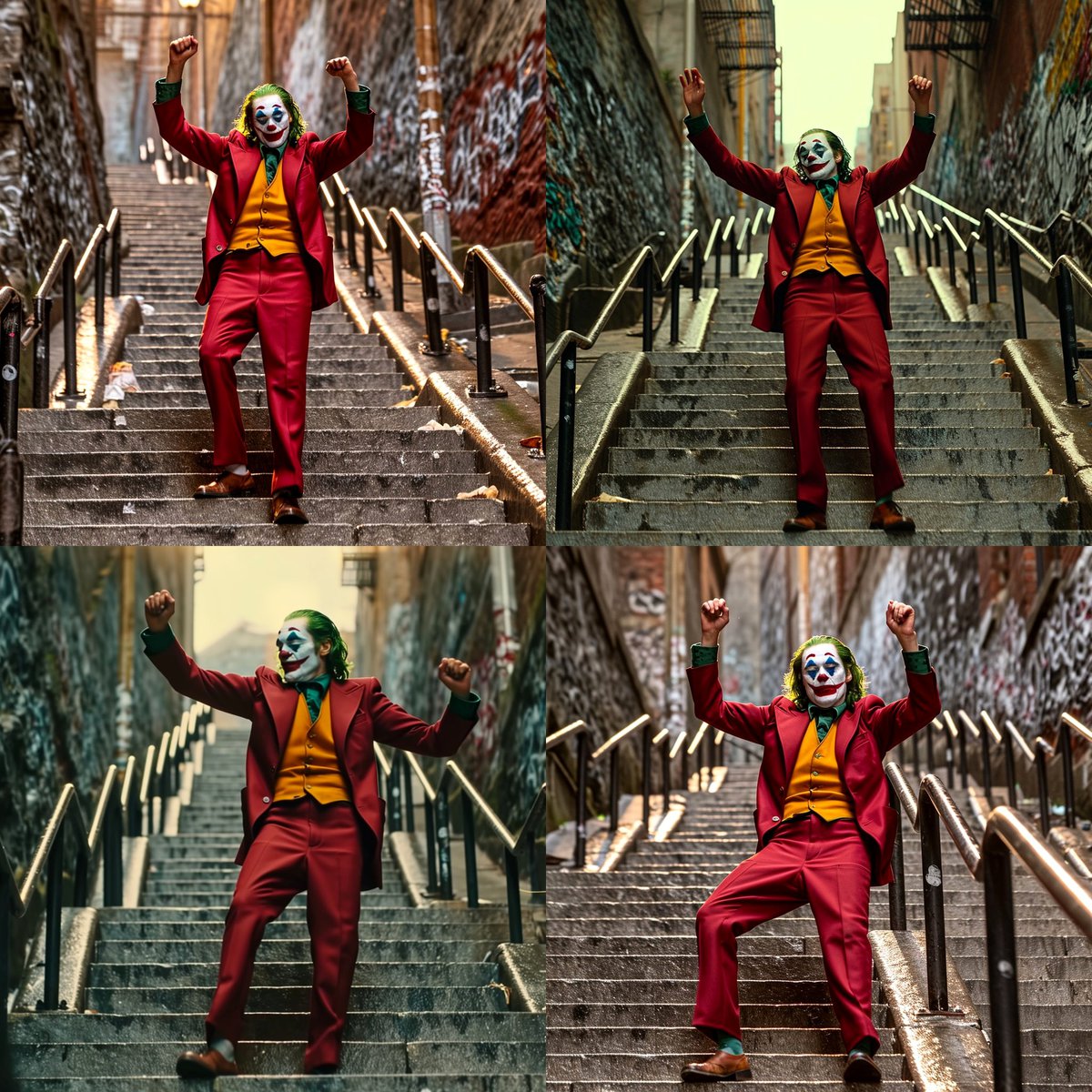 Нечто похожее можно получить по запросу «film still of Joker, scene where Joker is dancing on the stairs». Видимо, полагают энтузиасты, для обучения Midjourney V6 использовались кадры из популярных фильмов.