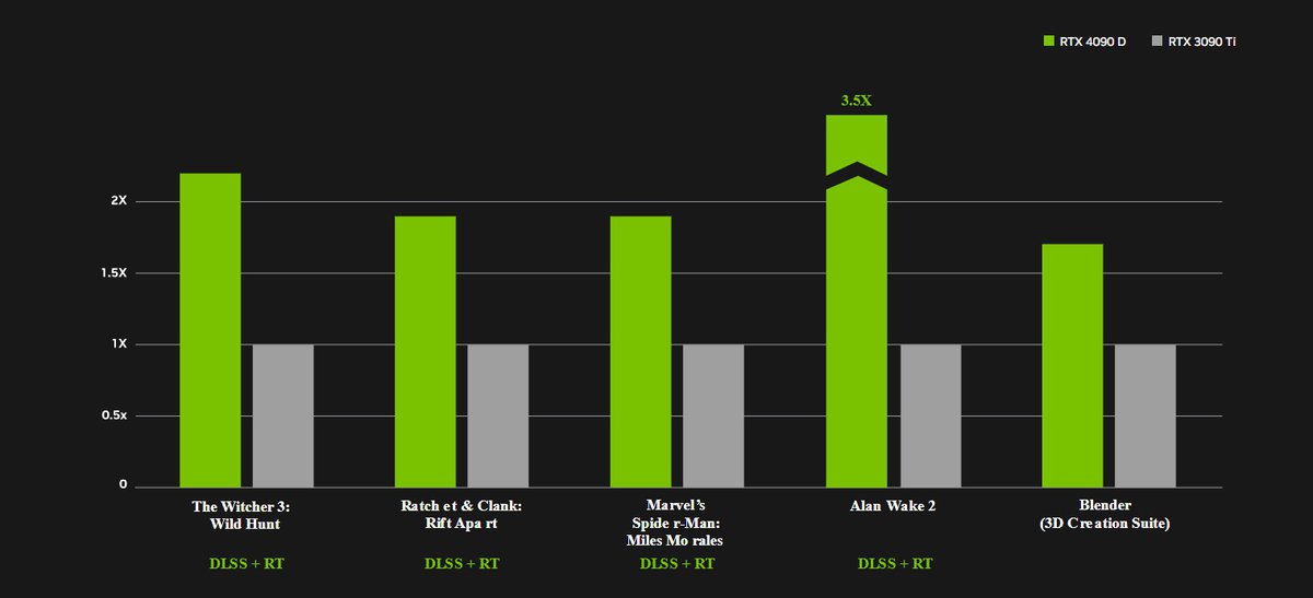 Интересный момент: для сравнения производительности GeForce RTX 4090 D и GeForce RTX 3090 Ti использовался не такой же набор игр, как при сравнении GeForce RTX 3090 Ti и обычной GeForce RTX 4090.
