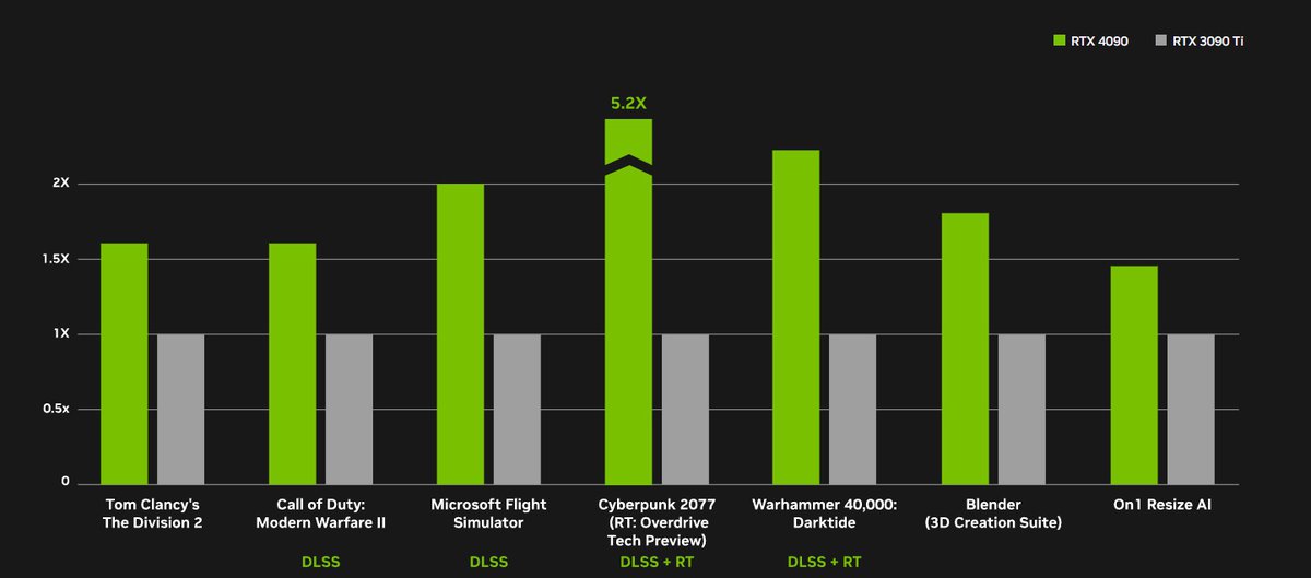 На сайте Nvidia не сообщается, какую производительность в терафлопсах выдает GeForce RTX 4090 D. Игровую производительность предлагается оценивать в сравнении с GeForce RTX 3090 Ti.