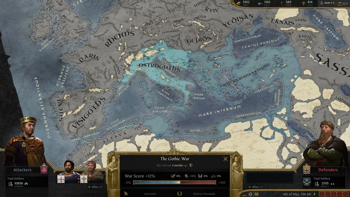 У Теодориха Великого не было нормального приемника. Он успел посадить на трон в Равенне своего молодого внука Аталариха, но тот несовершеннолетний. Paradox регенство в игре сделала, поэтому фактически правит дочка Теодориха, Амаласунта, однако нравится она не всей знати.