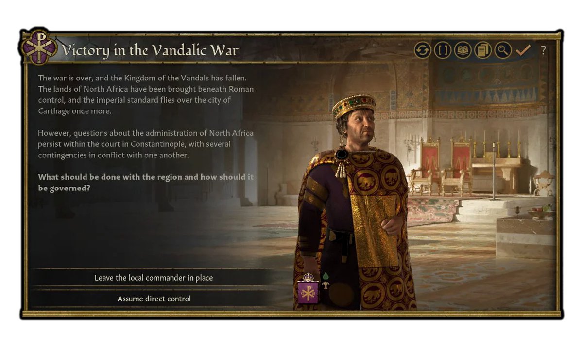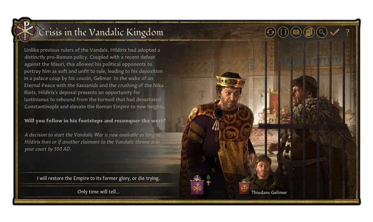 В начале игры Юстиниан получает донесение из Северной Африки о том, что проримский правитель Хильдирикс был свергнут своим двоюродным братом Гелимером, которого поддержали недовольные вассалы после некоторых поражений от рук местных правителей берберов. Юстиниану будет дан выбор: вторгнуться в Северную Африку или пока не надо.