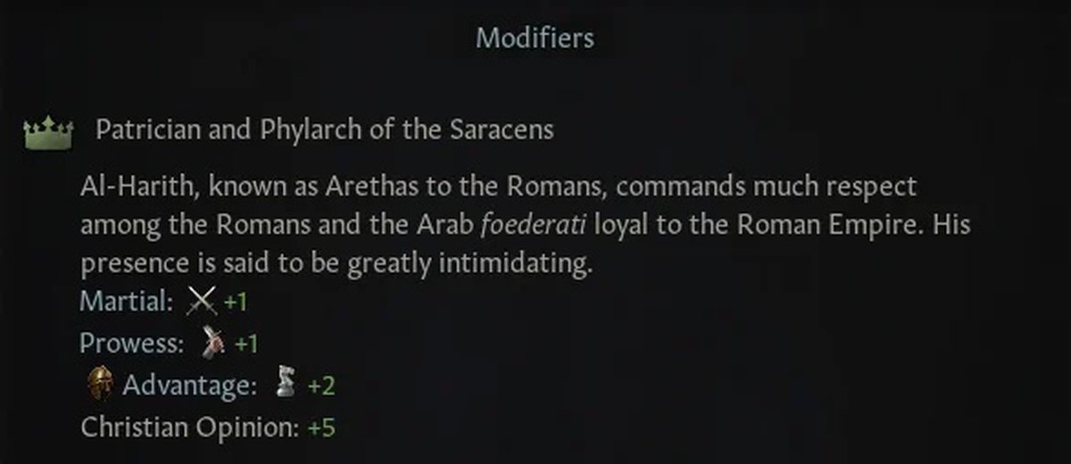 Некоторые персонажи получат личные модификаторы. Например, уже упомянутый внук Теодориха, Аталарих, и Аль-Мунзир III ибн аль-Харис, царь Гассанидов, которого, по слухам, уже император Византии Юстин II боялся.