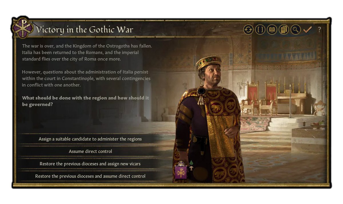 После завоевания Италии будут ивенты уже по управлению ею. Всё же там есть итальянская и остготская знать, что теперь с ними делать.