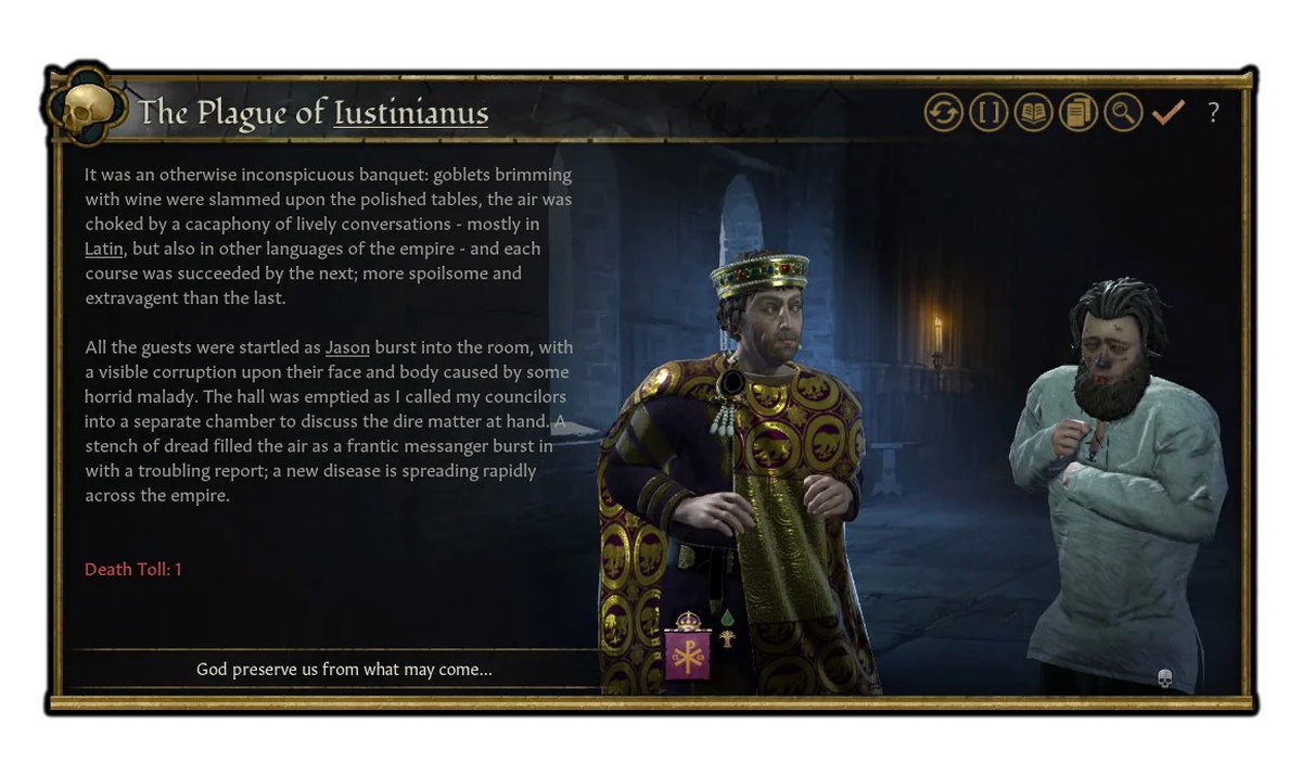 Но, наверное, когда говорят о Юстиниане, всем приходит в голову чума. Она тоже будет. Ежегодно кто-то будет заражаться, родственники, придворные, что может быть опасно. Также сказано о влиянии чумы на доход от Константинополя. Возможно, какой-то модификатор имеется в виду. К примеру, рост развития остановится, налоги не будут поступать. Число погибших подсчитывается.
