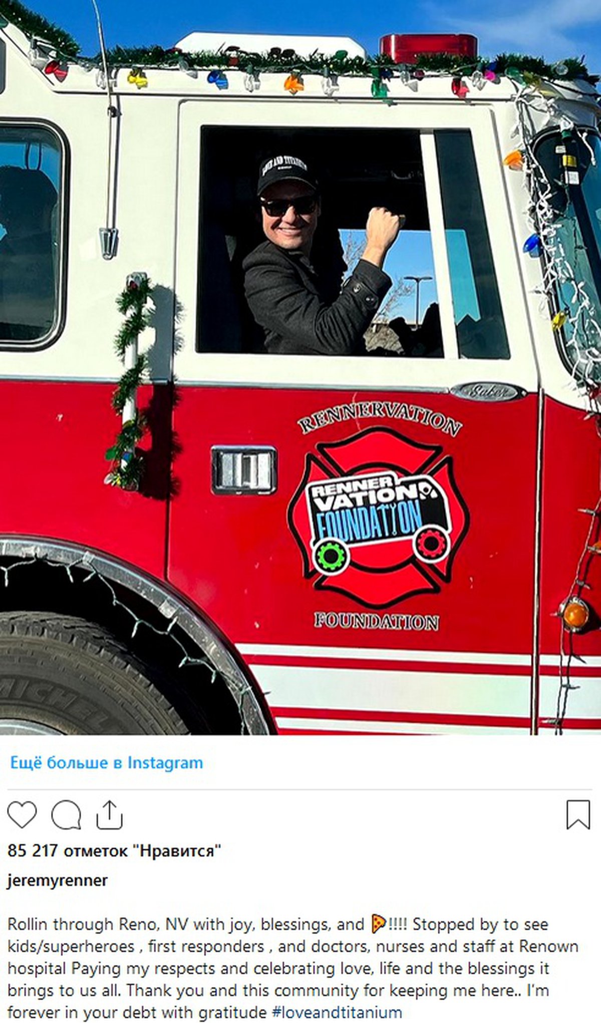 Немаловажную роль в успешном восстановлении, по мнению актёра, сыграл медицинский персонал регионального медицинского центра Renown. Сначала он поблагодарил врачей на своей странице Instagram*, а затем приехал самолично. Как написал Джереми, «с радостью, благодарностью и пиццей».