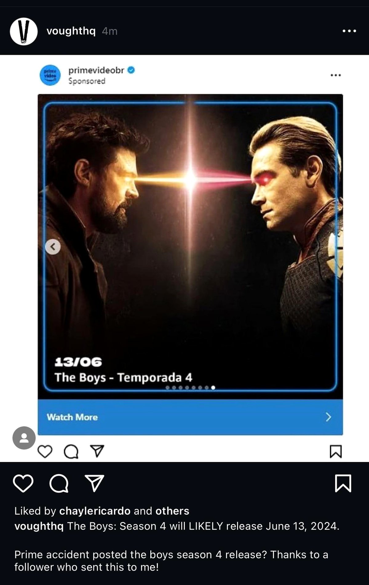 Премьера 4 сезона сериала «Пацаны» может состояться 13 июня 2024 года. Такая дата упоминается в рекламном посте, якобы опубликованном бразильским аккаунтом сервиса Amazon Prime.
